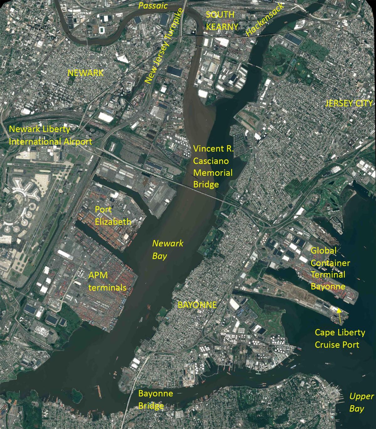Dans la même perspective, le Global Container Terminal Bayonne, port semi-automatisé, a été agrandi entre 2012 et 2014. Cette extension des installations portuaires se repère aisément sur l’image par ses darses ouvertes sur l’Océan Atlantique à partir de Upper Bay. Le quai le plus long fait 823 mètres et 15 m. de profondeur, permettant l’accostage de porte-conteneurs géants pour le stockage de conteneurs. Un entrepôt frigorifique surgelé complète ici l’organisation de la logistique. L’ensemble comprend aussi un terminal de croisière (Cape Liberty Cruise Port).