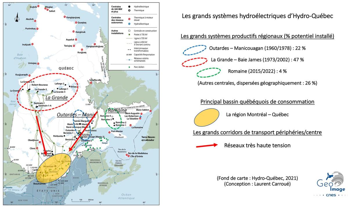 Ce fort différentiel tarifaire et les surplus dont dispose Hydro-Québec expliquent l’importance des exportations d’électricité qui représentent 17 % des volumes de vente totale, mais presque un quart des revenus nets. Les grands aménagements comme La Grande – Baie James ou Manic-Outardes alimentent donc non seulement le pôle Québec/Montréal, qui constitue le cœur du Québec politique, économique et démographique, mais aussi l’Ontario au Canada ou les États fédérés du Maine, de New-York ou du Massachussetts aux Etats-Unis voisins.