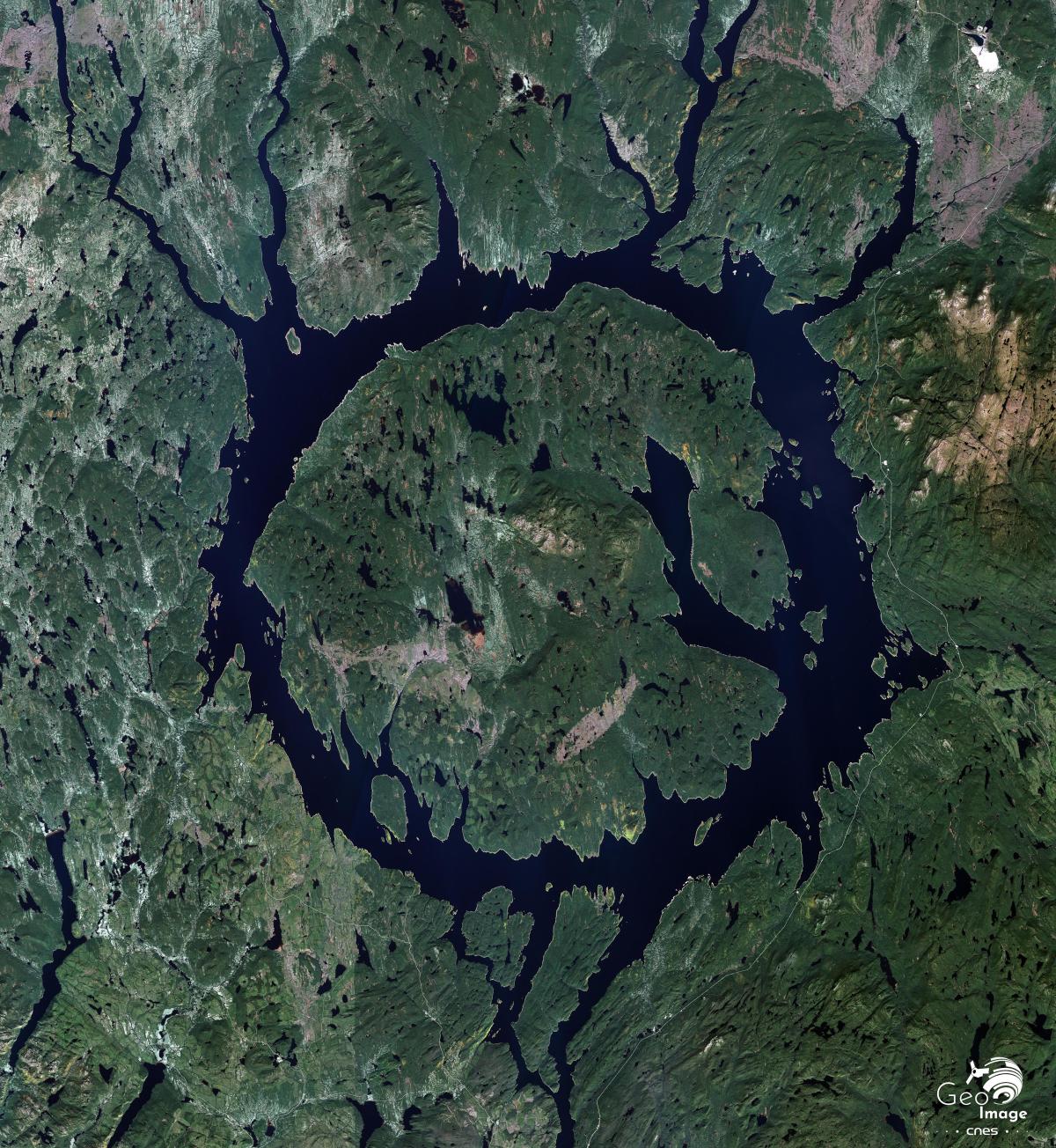 Celui-ci se trouve à une altitude moyenne de 360 m. Ce lac-réservoir est totalement artificiel et a été créé par la construction du barrage Daniel-Johnson, qui se trouve plus au sud (hors image, zooms suivants) en 1970. La création du réservoir s’est traduite par l’ennoiement d’une une vaste dépression topographique de forme circulaire bien visible sur l’image. La forme circulaire du réservoir qui lui vaut le surnom d’« Œil du Québec » est en effet bien visible, que ça soit de l’espace ou d’avion. Elle correspond à un cratère de 100 km de diamètres créé il y a 214 millions d’années par l’impact d’un gigantesque météoritique dont la taille est évaluée à 5 km de diamètre.