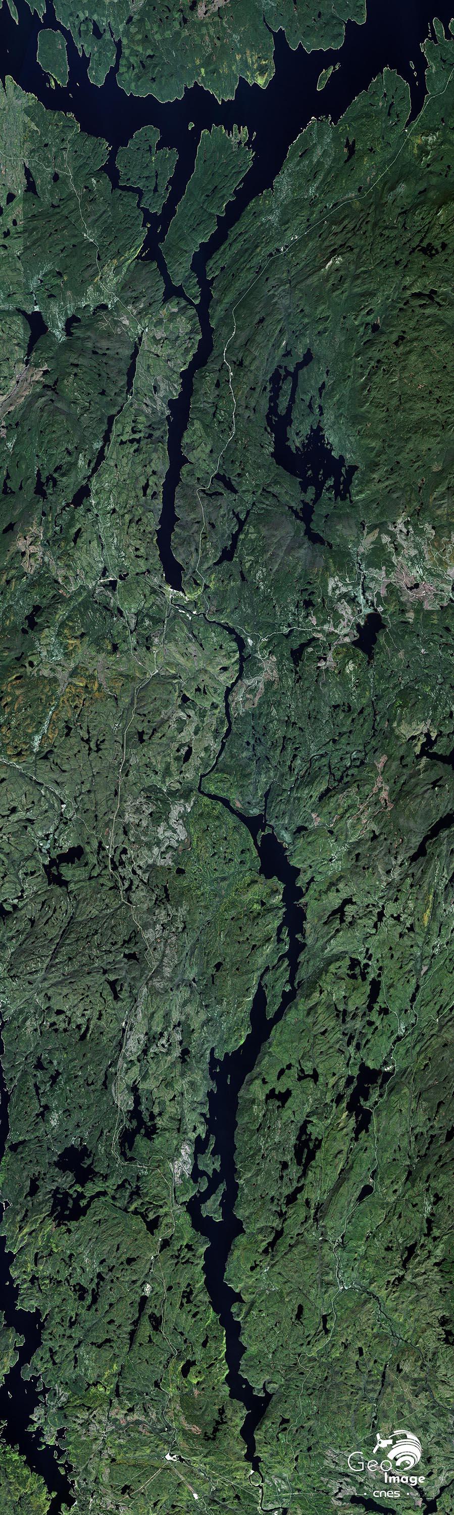 L’image présente un espace relativement accidenté couvert de nombreux lacs et très largement boisé. Au centre se distingue facilement une grande île ronde - l’île René Levasseur - entourée d’un grand lac circulaire – le lac-réservoir de Manicouagan - duquel descend vers le sud une puissante rivière, la Rivière Manicouagan. Plus à l’ouest, une autre rivière – la Rivière aux Outardes – descend du lac Pletipi pour devenir parallèle à la première. Nous sommes ici au Québec, sur la Côte Nord – donc en rive gauche de l’estuaire du St Laurent – dans les Laurentides centrales, une vaste région de 200.000 km² qui s’étend du Saguenay à l’ouest à Terre Neuve à l’est. La région est dominée par un climat subpolaire froid à saison végétative moyenne puis courte.
