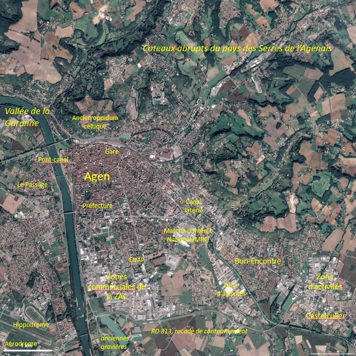 Le site d’Agen épouse celui d’Aginnum, cité gallo-romaine implantée sur la rive droite de la Garonne, dans une plaine inondable et sur quelques lambeaux de la basse terrasse. Le cœur de ville s’adosse aux coteaux abrupts du pays des Serres qui viennent rejoindre le fleuve au nord de la ville. On repère aisément au pied du coteau, les voies ferrées de la gare d’Agen (gris) et le canal latéral à la Garonne (bleu ciel) qui s’élargit en port (au nord de la gare). Plus au nord, sur le plateau, une vaste flaque brune correspond à de grandes parcelles agricoles labourées (en novembre). Elles sont installées sur l’ancien oppidum celtique de la tribu des Nitiobriges ; un site qui n’a été que brièvement occupé du II au Ier siècle av JC.
