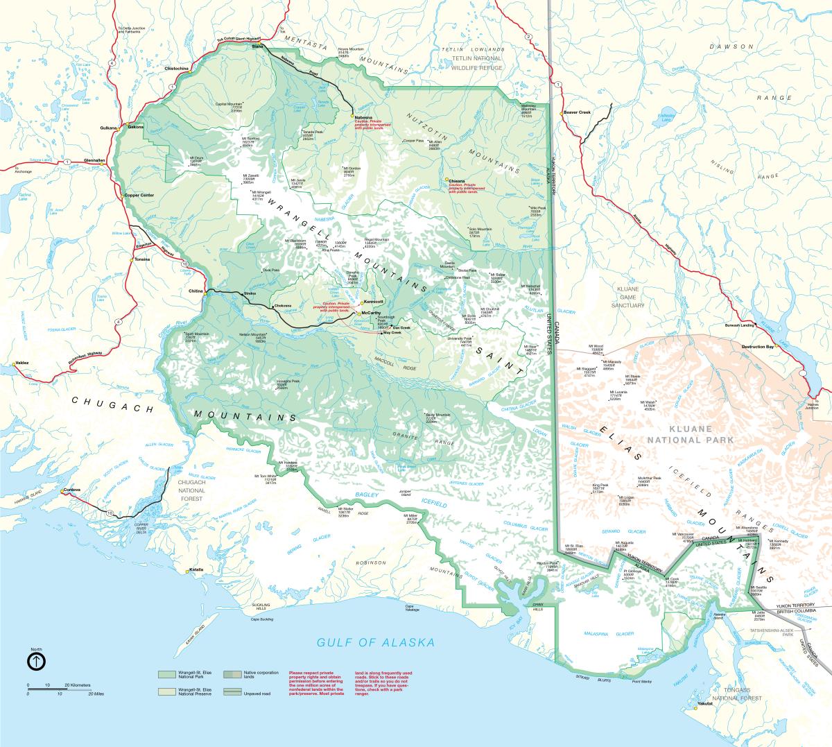 La carte ci-contre présente la région du parc Wrangell-St Elias, le plus grand parc national des États-Unis.