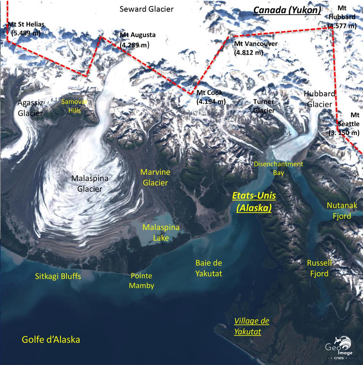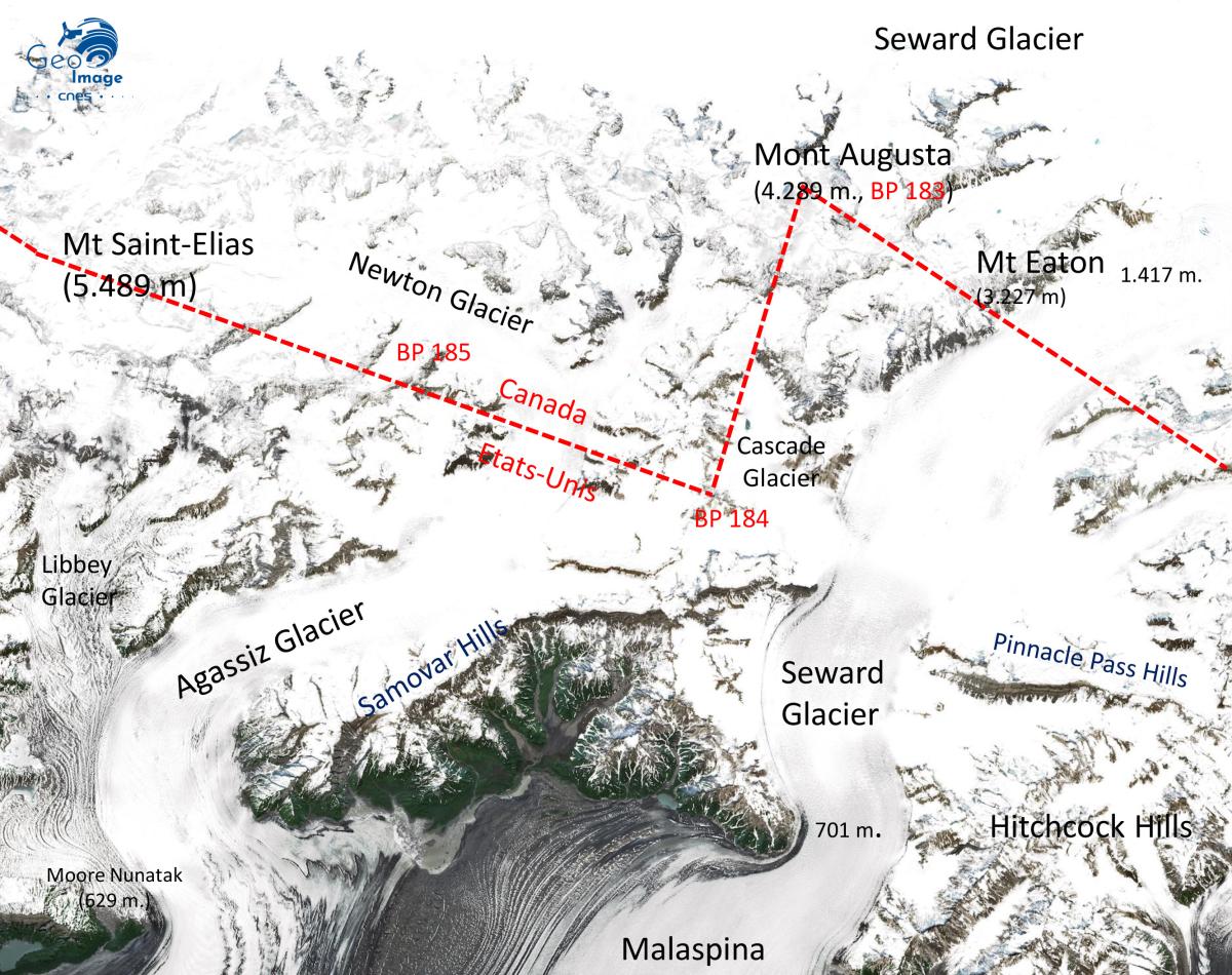 Dans cet espace de hauts plateaux englacés apparaissent des crêtes dominées par des hauts sommets. Ces hauteurs glacées sont particulièrement inhospitalières, et donc désertiques. On peut identifier sur l’image le Mt Eaton (3.227 m), le Mont Augusta (4.289 m) ou le Mt St Elias (5.489 m) qui servent de repères pour tracer au cordeau comme « Boundary Peak » la frontière entre les deux États.  Au plan morphologique, une analyse de détail fait bien apparaitre les crevasses et les séracs, qui sont liés à une déformation cassante de la glace du fait de la pente, du passage d’un seuil ou d’un verrou topographique.