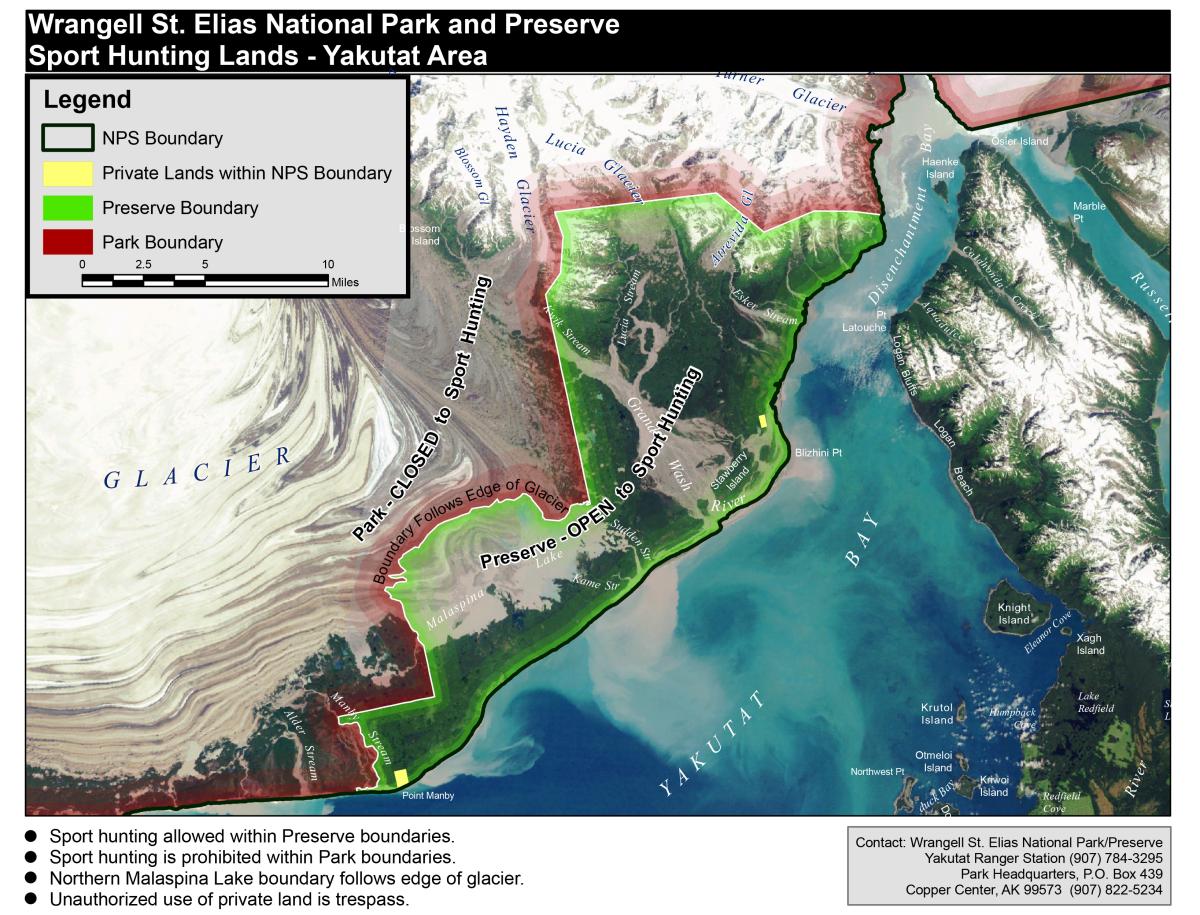 C’est d’ailleurs pourquoi toute la zone comprise entre la Pointe Manby et la Baie du désenchantement et le littoral et la retombée directe du Glacier Malaspina (cf. Boundary Follows Edge of Glacier) a été ouverte comme « terrains de chasse sportive » dans le cadre du Parc National Wrangell St Elias.  Au Canada comme aux États-Unis, la chasse à la grande faune sauvage arctique, péri-arctique ou boréale, en particulier les ours, demeure recherchée et souvent fort lucrative. Elle peut aussi par les prélèvements effectués participer à la gestion des stocks.
