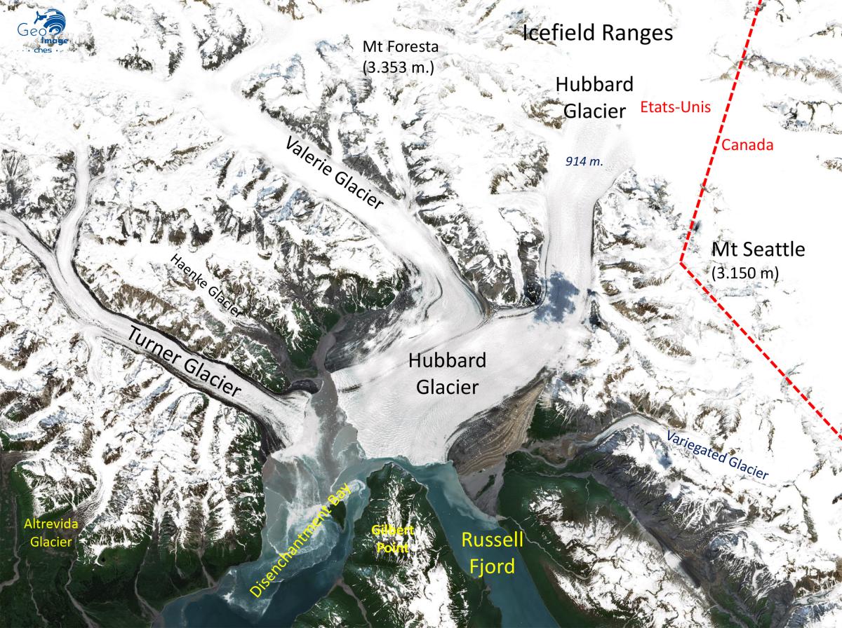 Les Icefield Ranges, dominées par les Monts Seattle (3.150 m.) et Foresta (3.353 m), sont bien visibles, tout comme les puissants glaciers (Turner, Valerie) qui est descendent. A l’ouest, le « petit » Variegated Glacier, de 20 km de long, est sans doute l’un des glaciers les plus étudiés au monde. C’est en effet par excellence le modèle du surge-glacier, certains surges s’y traduisant par des avancées de plus de 6 km comme en témoigne la structure bouleversée de sa langue terminale.