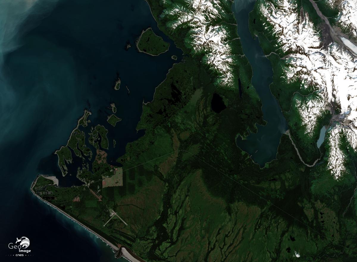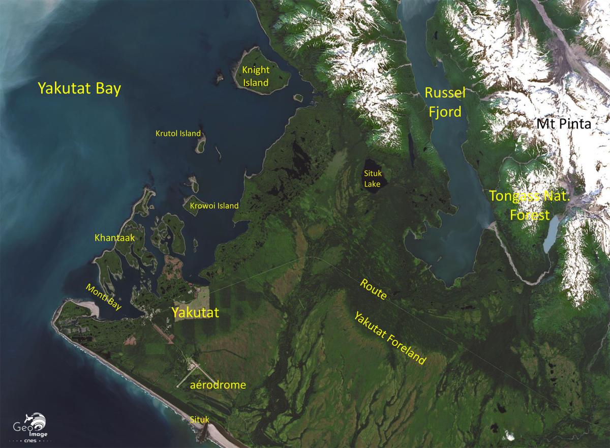 Enfin, dans l’angle sud-est de l’image au sud de la zone des fjords, se déploie une étroite plaine littorale. Face au Malaspina et sur la rive est de la baie de Yakutat se trouve le petit village de Yakutat situé à 21 m d’hauteur. Il n’est pas directement sur le bord de mer, mais en position d’abri derrière un cap et un rideau d’iles qui le protège du grand large.