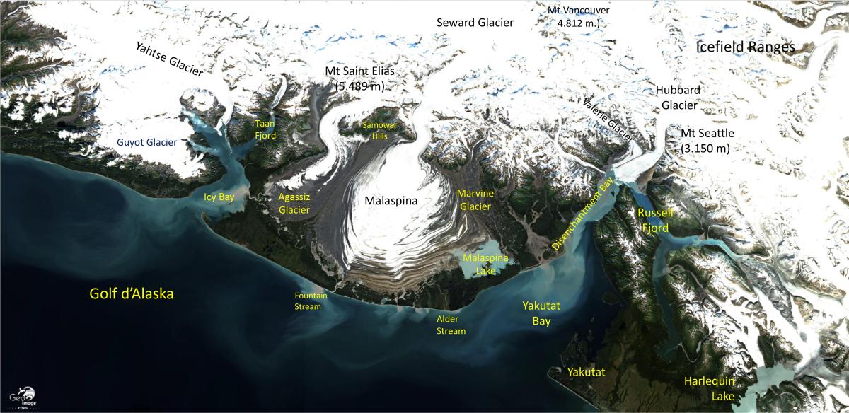 L’image est centrée sur le Malaspina et son système glaciaire. Elle permet de bien comprendre les dynamiques glaciaires en lien avec les différents milieux qui s’étagent en altitude ; ils présentent donc des paysages caractéristiques bien identifiables : hautes chaînes et plateaux intérieurs, chaîne littorale et rupture topographique, plaine littorale.