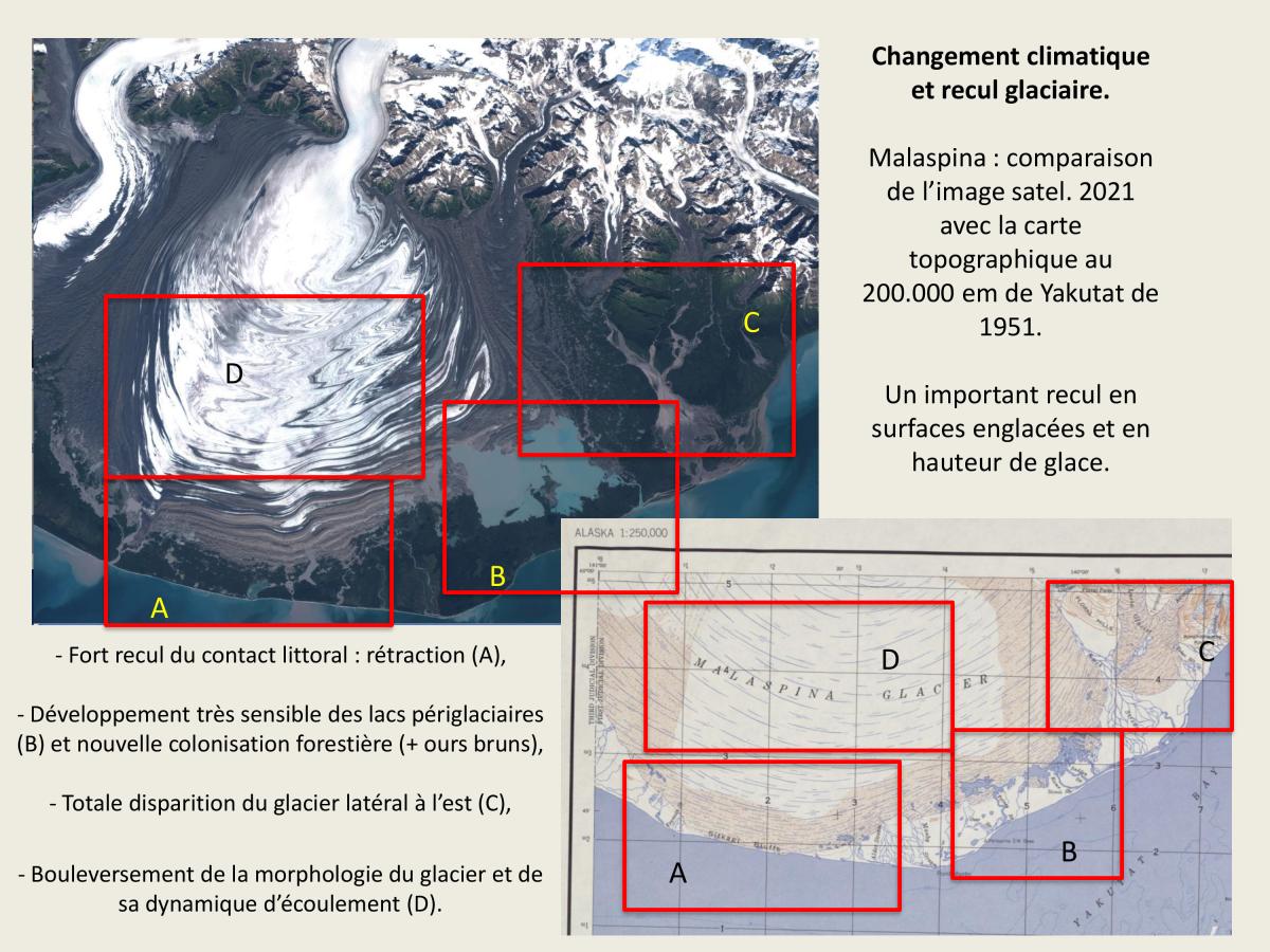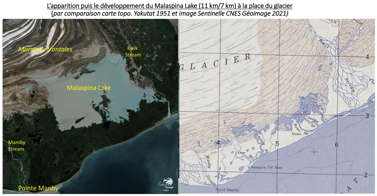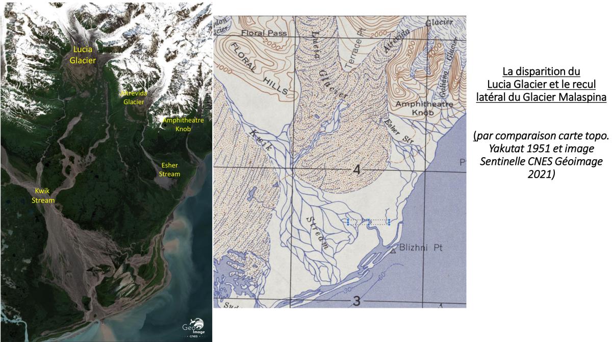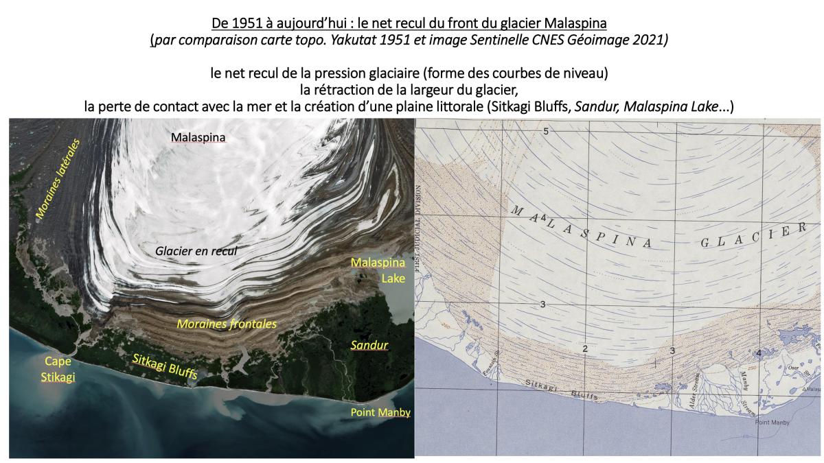 La région est du Malaspina Glacier permet d’étudier les transformations morphologiques et paysagères liées au recul glaciaire dans les hautes latitudes. A cet égard, la comparaison entre l’image satellite Sentinelle de 2021 et la carte topographique de 1951 est fort instructive.