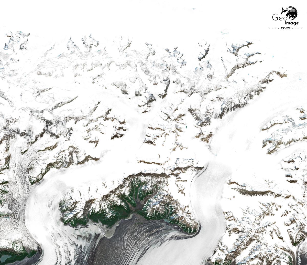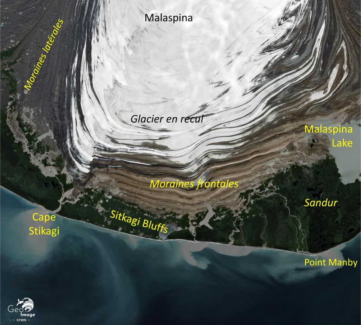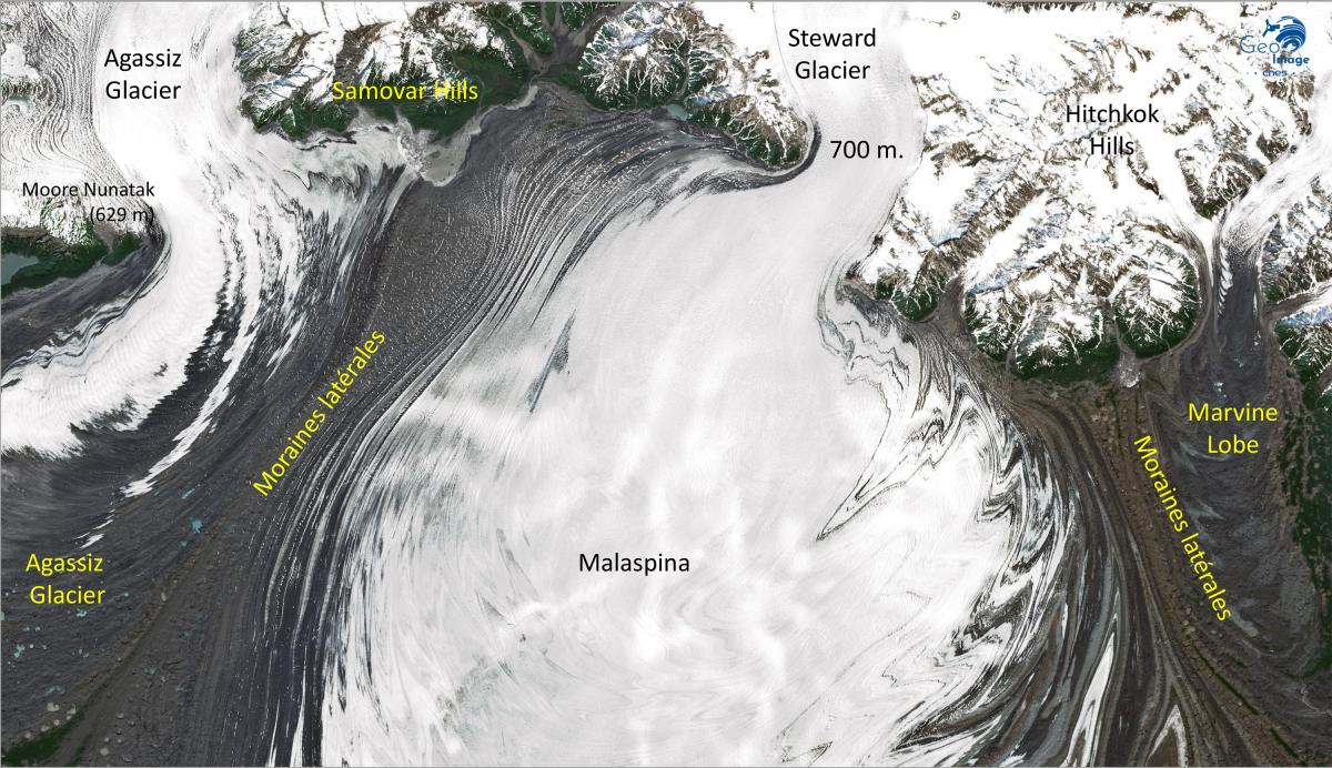 Un des intérêts de cette image tient enfin dans la juxtaposition de trois situations glaciaires très différentes. Au centre, le Malaspina Glacier encore bien alimenté demeure dynamique. A l’ouest, l’Agassiz Glacier témoigne d’une situation intermédiaire : si le haut du glacier demeure actif, la partie terminale dans la plaine est dorénavant couverte par les moraines terminales et est en sensible voie de rétraction du fait d’un bilan devenu problématique. A l’est enfin, le Marvine Glacier n’est plus que l’ombre de lui-même, c’est dorénavant un glacier rocheux qui témoigne d’un fort recul dû à un bilan structurel fortement négatif.