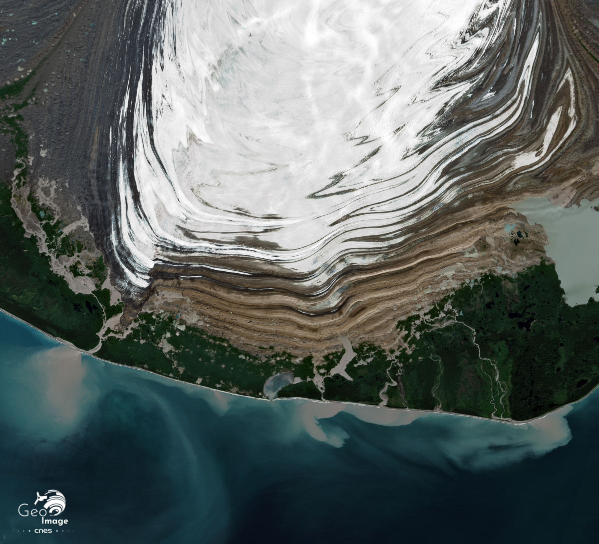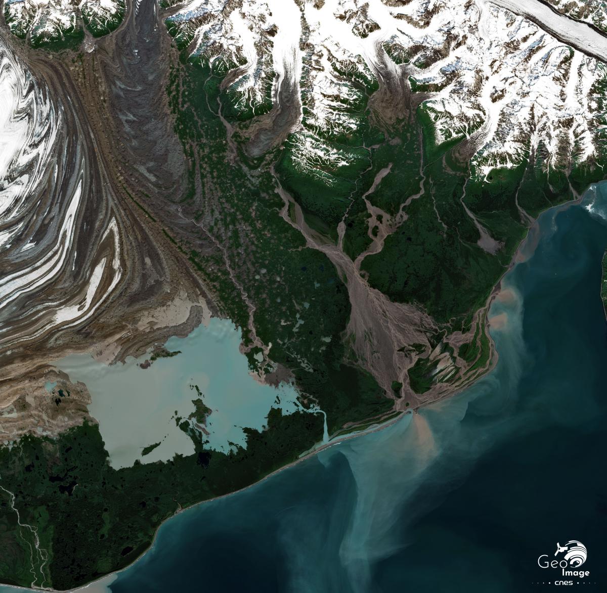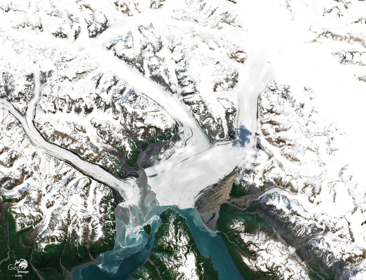 Un des intérêts de cette image tient enfin dans la juxtaposition de trois situations glaciaires très différentes. Au centre, le Malaspina Glacier encore bien alimenté demeure dynamique. A l’ouest, l’Agassiz Glacier témoigne d’une situation intermédiaire : si le haut du glacier demeure actif, la partie terminale dans la plaine est dorénavant couverte par les moraines terminales et est en sensible voie de rétraction du fait d’un bilan devenu problématique. A l’est enfin, le Marvine Glacier n’est plus que l’ombre de lui-même, c’est dorénavant un glacier rocheux qui témoigne d’un fort recul dû à un bilan structurel fortement négatif.