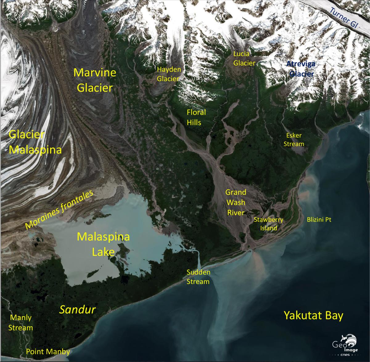 Au bord de la mer, on assiste à une sensible régression du glacier dans la zone de fonte et d’évaporation située à l’avant du glacier comme en témoigne l’extension considérable du Malaspina Lake en quelques décennies. Le paysage régional a été totalement bouleversé par la création d’un lac d’environ 80 km2, de forme presque rectangulaire. Bloquées par un bourrelet de moraines déposées par le Malaspina, ses eaux s’évacuent à l’est vers la mer par un émissaire bien visible sur l’image.