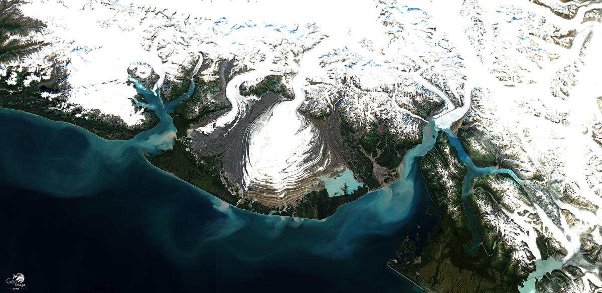 Cette image du glacier Malaspina, glacier de piémont qui se trouve en Alaska a été prise le 29 août 2018 par un satellite Sentinel-2A. Il s’agit d’une image en couleurs naturelles de résolution à 10m.