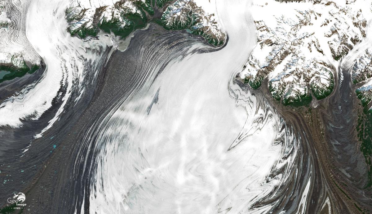 L’image témoigne bien aussi des énormes masses de moraines arrachées aux montagnes qui participent du vaste processus d’érosion. Dans le cycle érosion/ transport/accumulation, nous sommes à la fois selon la zone soit dans le processus de transport, soit dans le processus de dépôt/ accumulation.  Les formes du Marvine Lobe à l’est et de l’Adassiz Glacier à l’ouest soulignent l’importance des surges dans l’organisation et la forme de certaines parties des glaciers, en particulier terminales.
