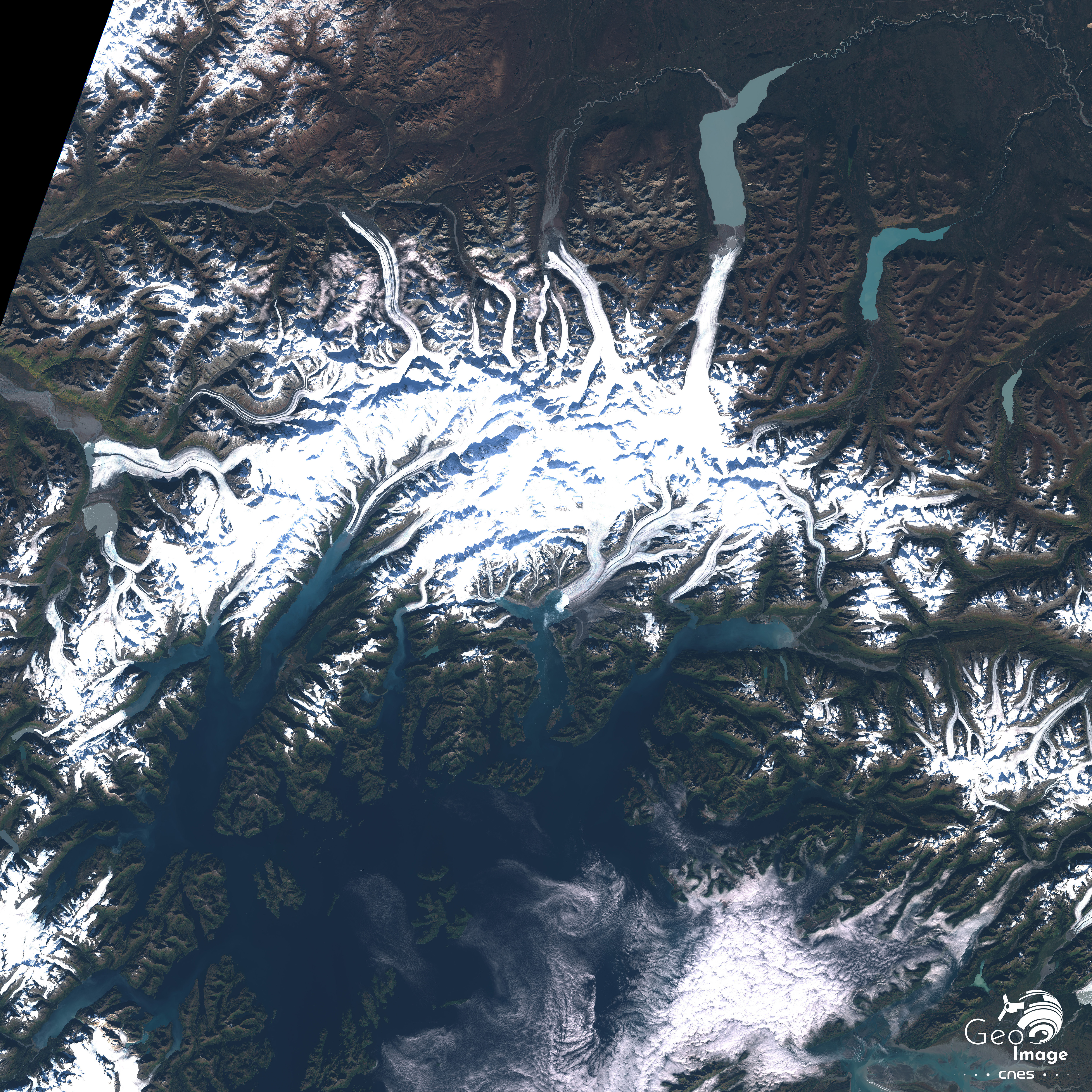 Cette image traitée en fausses couleurs afin de bien faire ressortir les appareils glaciaires est centrée sur la chaine des Monts Chugach. En position littorale, elle se déploie sur 480 km d’est en ouest et 97 km du sud au nord. Cette chaine appartient à l’importante chaine de montagne qui ourle tout le littoral sud de l’Alaska et au-delà, les Pacific Coast Ranges.