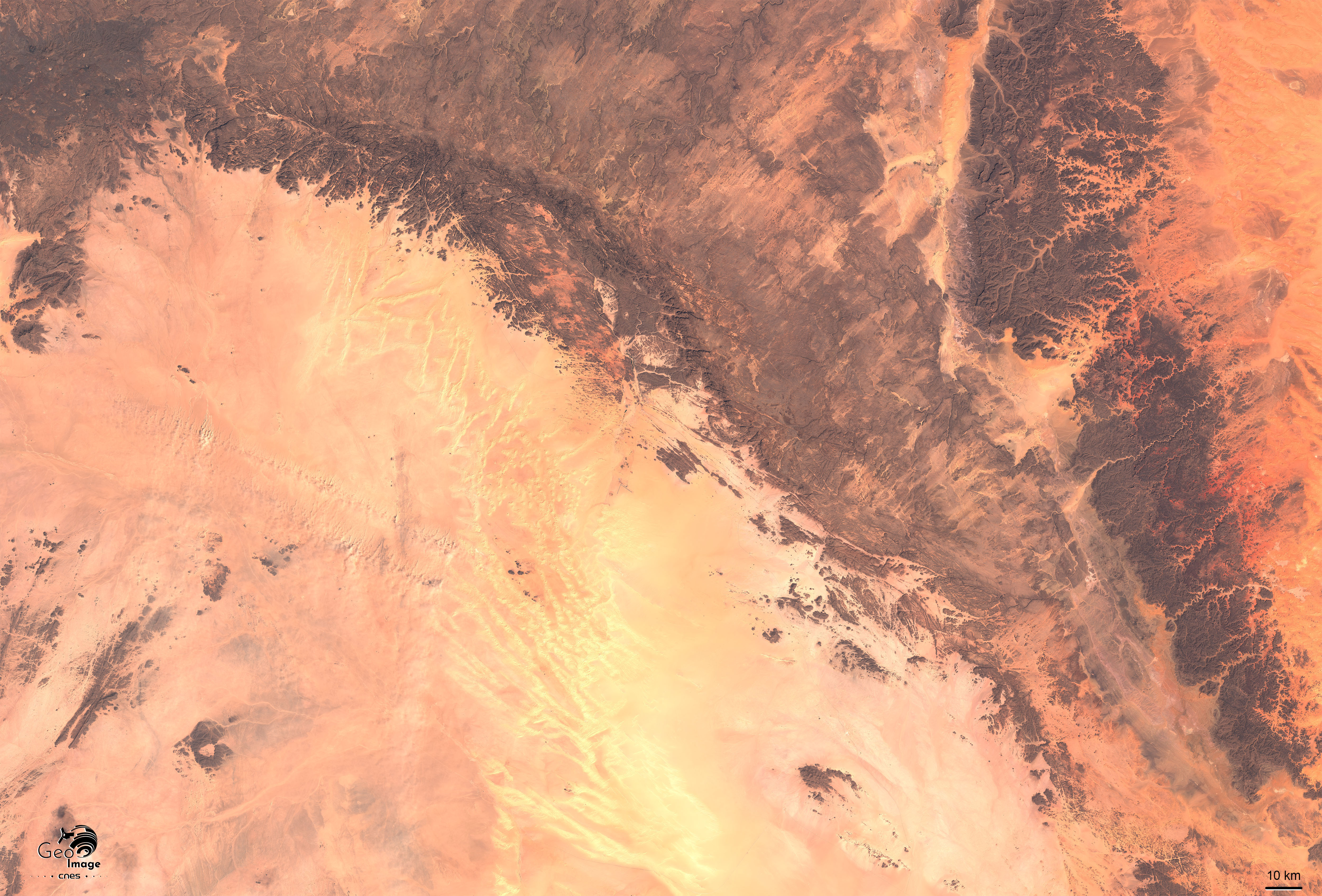 Dans le sud-est du Sahara algérien, à la frontière avec la Libye, l'image du massif du Tassili n’Ajjer a été prise par le satellite Sentinel-2B le 8 mars 2020. Il s’agit d’une image en couleurs naturelles de résolution native à 10m.