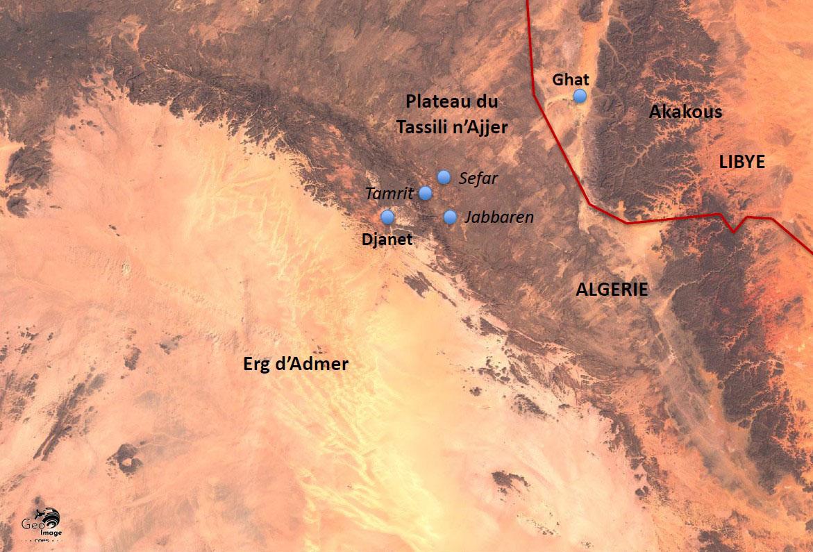 De part et d’autre du Tassili n’Ajjer se trouvent les deux oasis de Ghat, en Libye, et de Djanet, en Algérie, toutes deux visibles sur l’image. Leur organisation et leurs trajectoires dont bien différenciées.