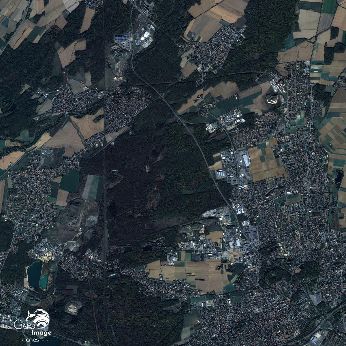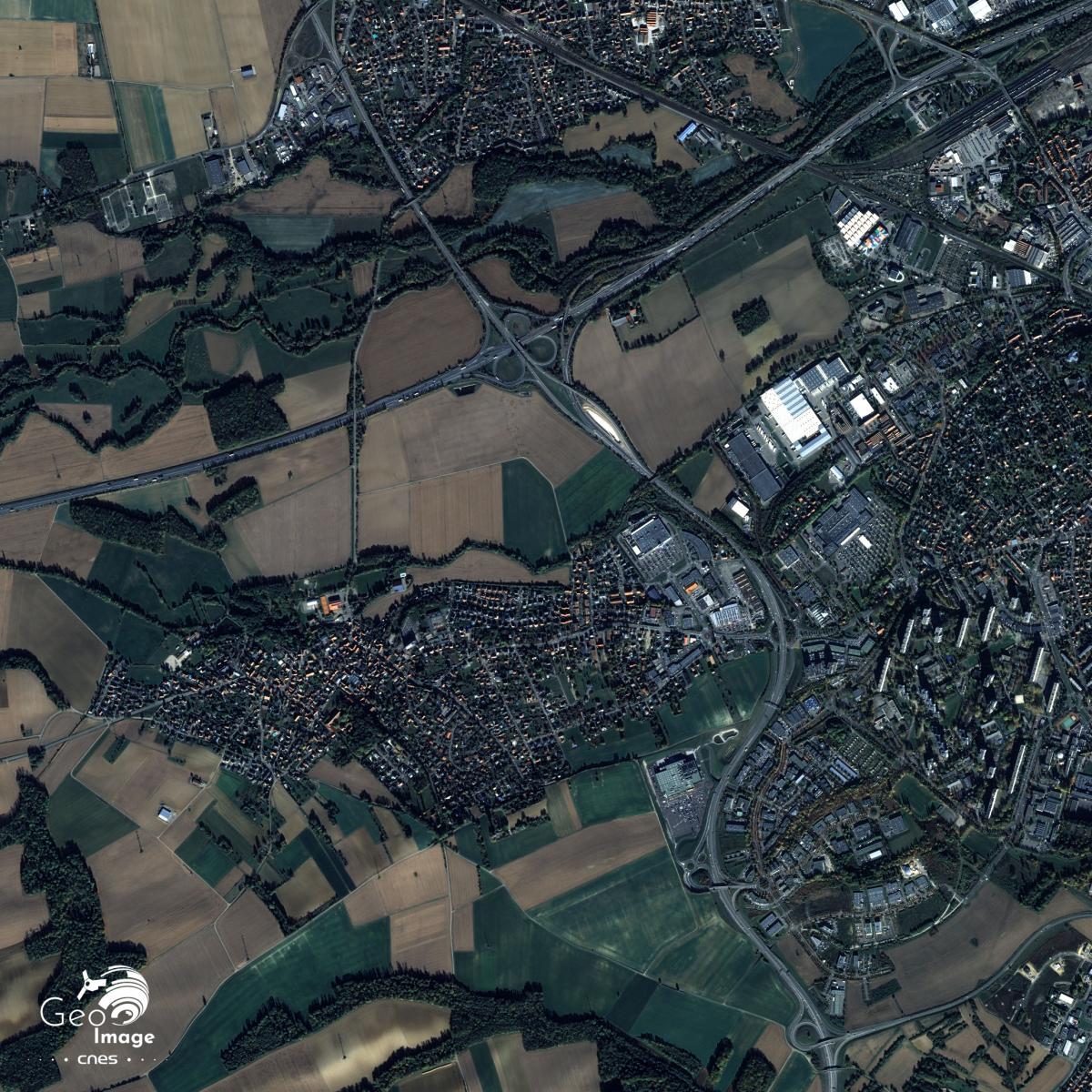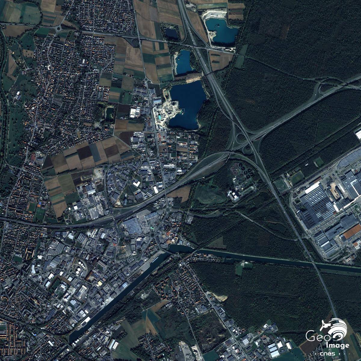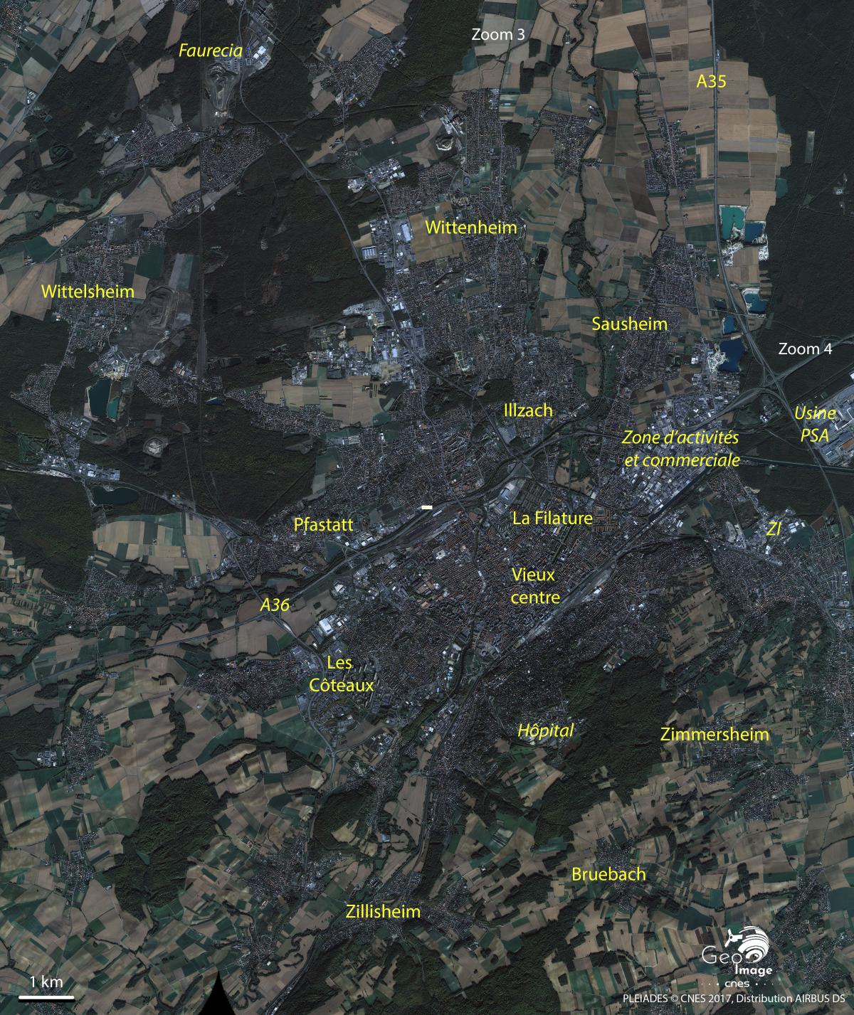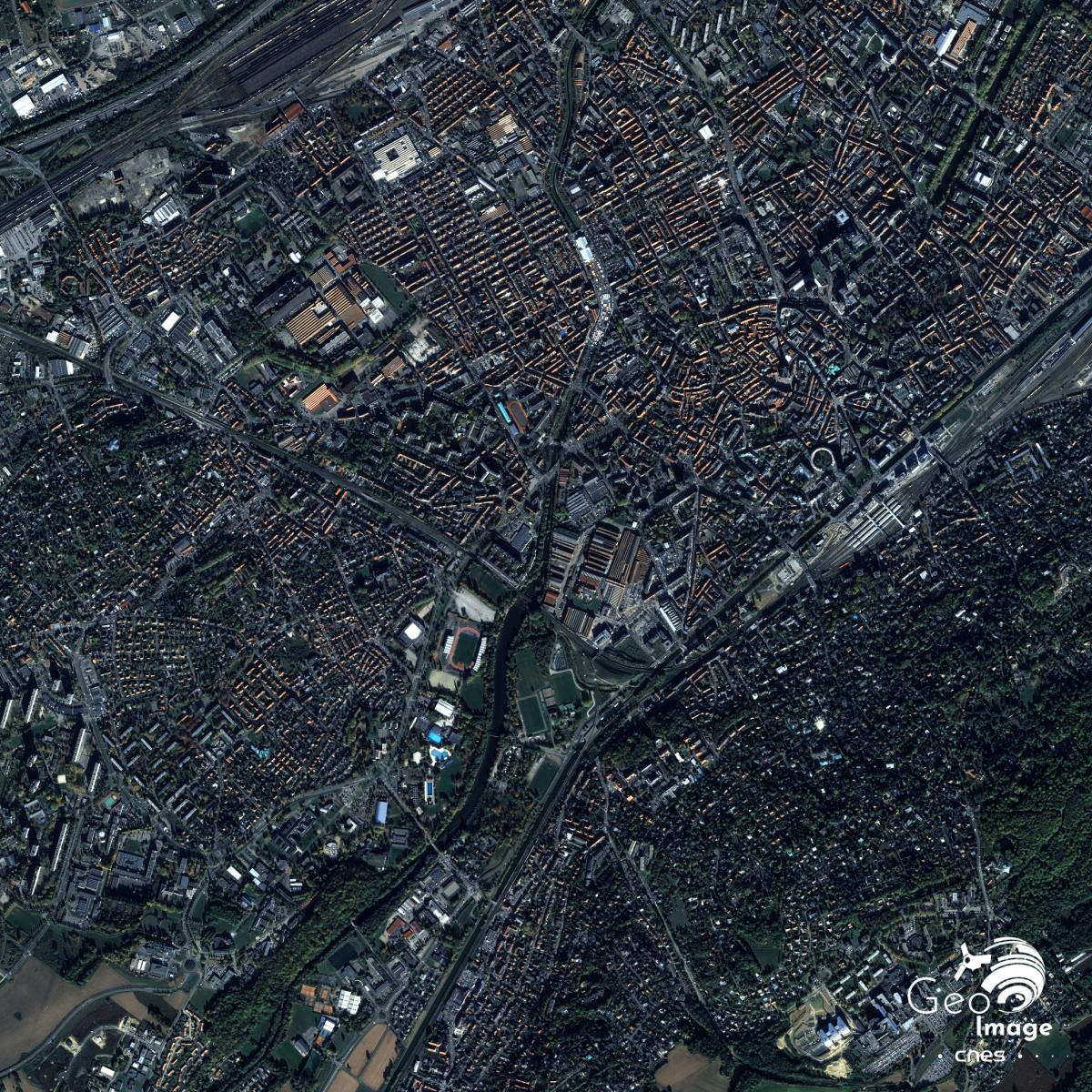 Ci-dessous, l'image satellite Pleiades, présente quelques repères géographiques de l'agglomération située dans le Nord -Est de la France, près des frontières suisse et allemande :