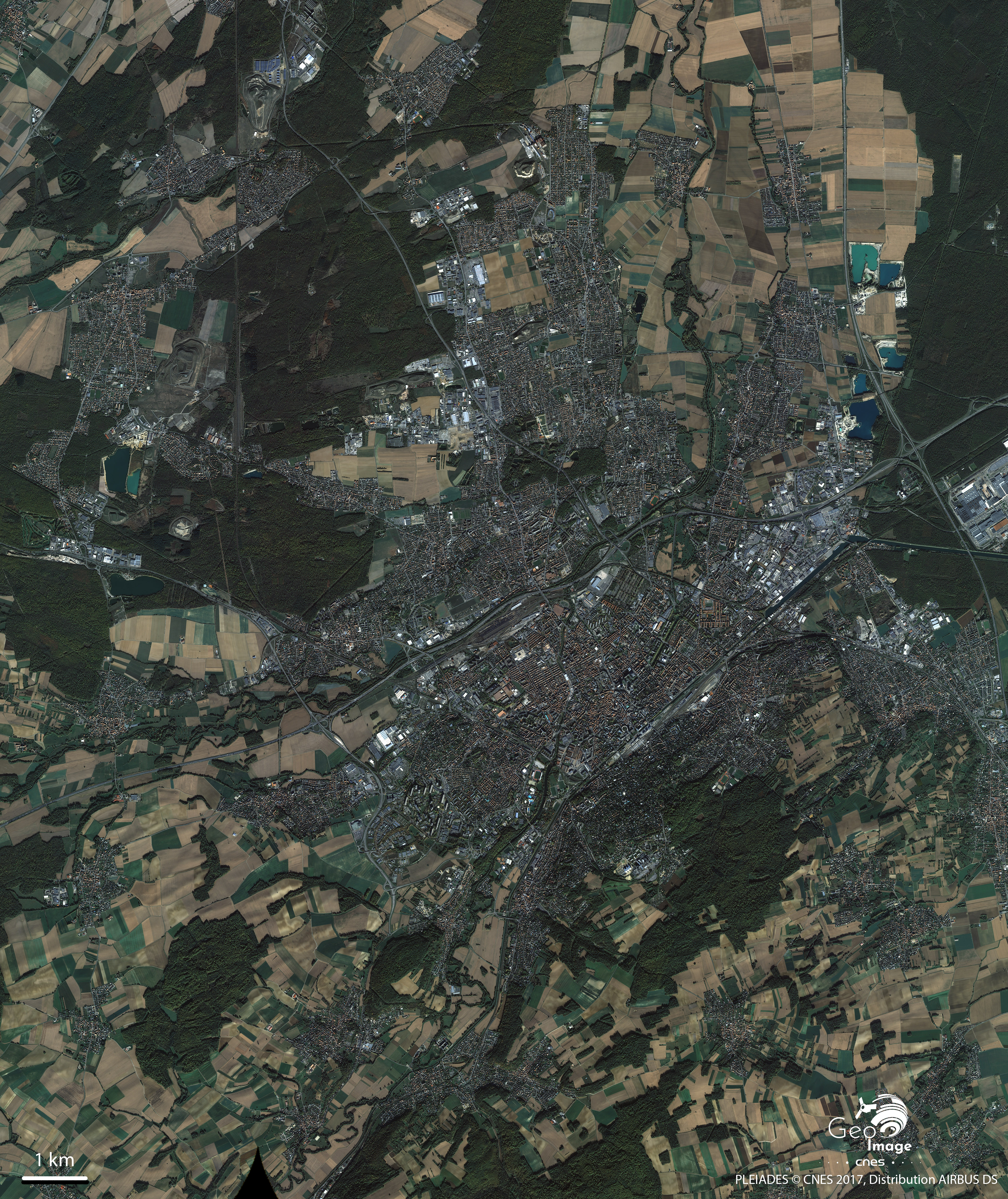 Ci-dessous, l'image satellite Pleiades, présente quelques repères géographiques de l'agglomération située dans le Nord -Est de la France, près des frontières suisse et allemande :