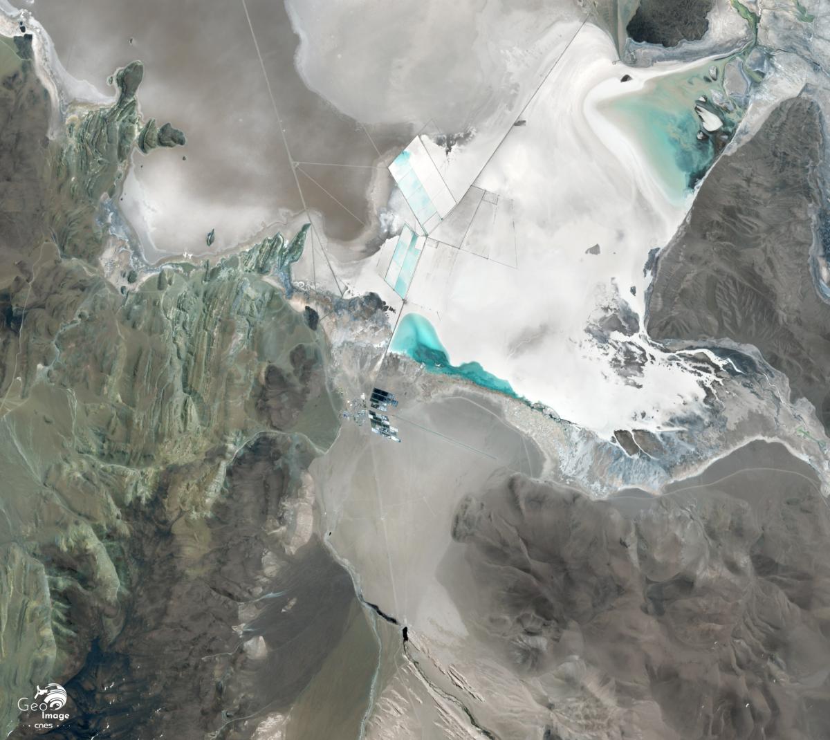 Sur l’image apparaît une trentaine de piscines d’évaporation, qui s’étend sur un peu moins de 20 hectares. Il s’agit pour le moment de piscines pilotes, de différentes tailles, utilisées durant la phase de faisabilité du projet. En vue de l’entrée en production, il est prévu la construction de 320 hectares de bassins d’évaporation et une usine de traitement du carbonate de lithium.