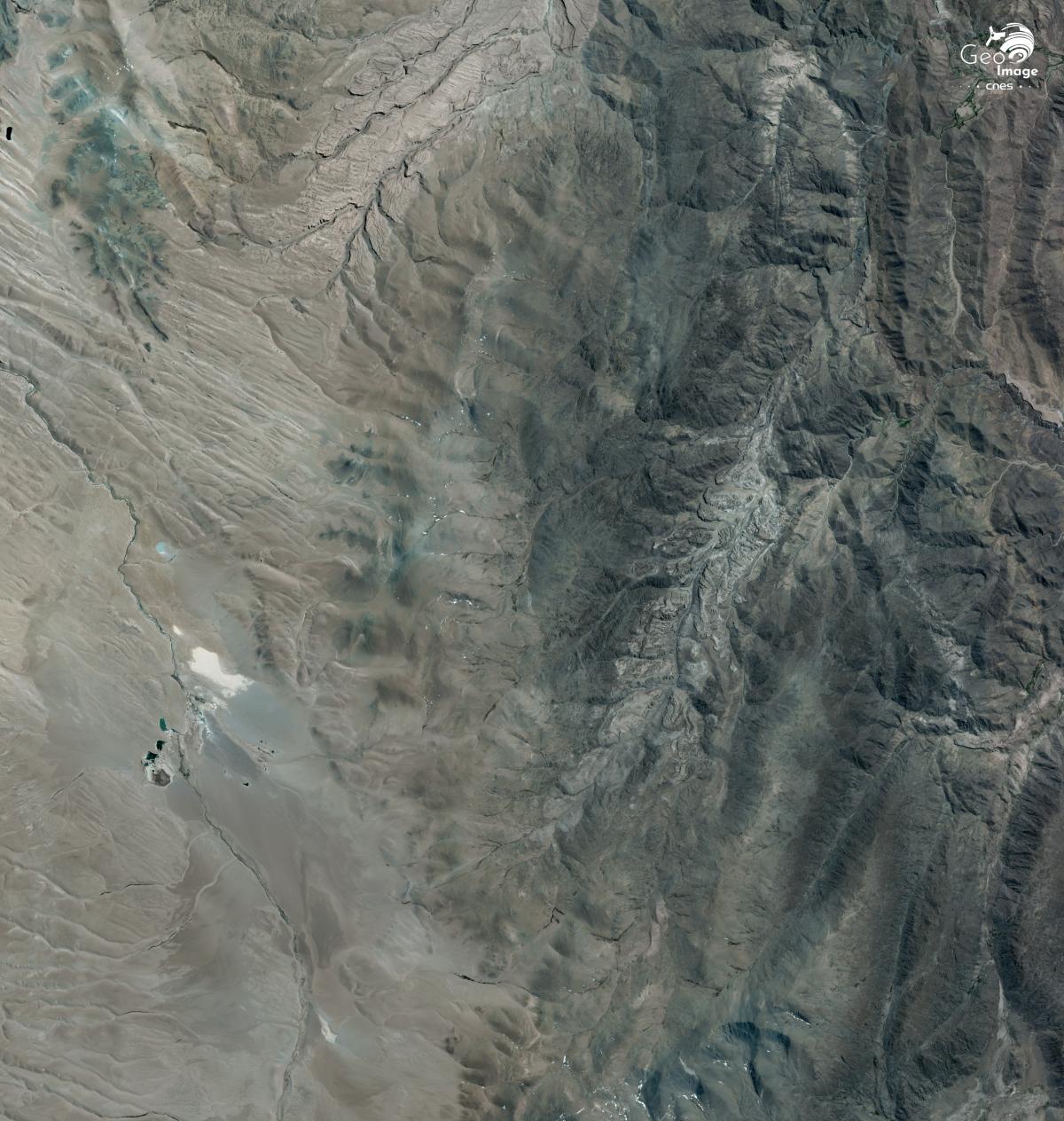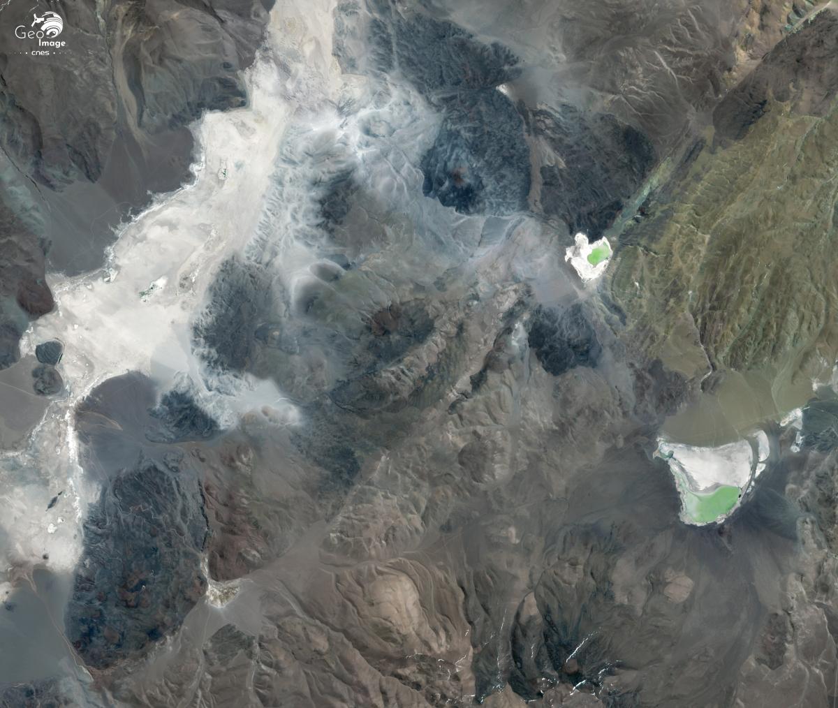 Cette image montre le salar Diablillos, situé au Nord-Est du salar Hombre Muerto, dont il est séparé par le Cerro Ratones, un sommet qui culmine à 5 092 mètres d’altitude. Là aussi, des piscines d’évaporation ont été aménagées, dans le cadre d’un projet d’exploitation de lithium. Le cas de ce petit salar illustre le phénomène de multiplication des projets d’exploitation de lithium en Argentine, qui concerne jusqu’aux plus petits salares, aux réserves modestes. Certains projets peinent toutefois à parvenir au stade d’exploitation industrielle, les investisseurs et repreneurs se succèdent rapidement.
