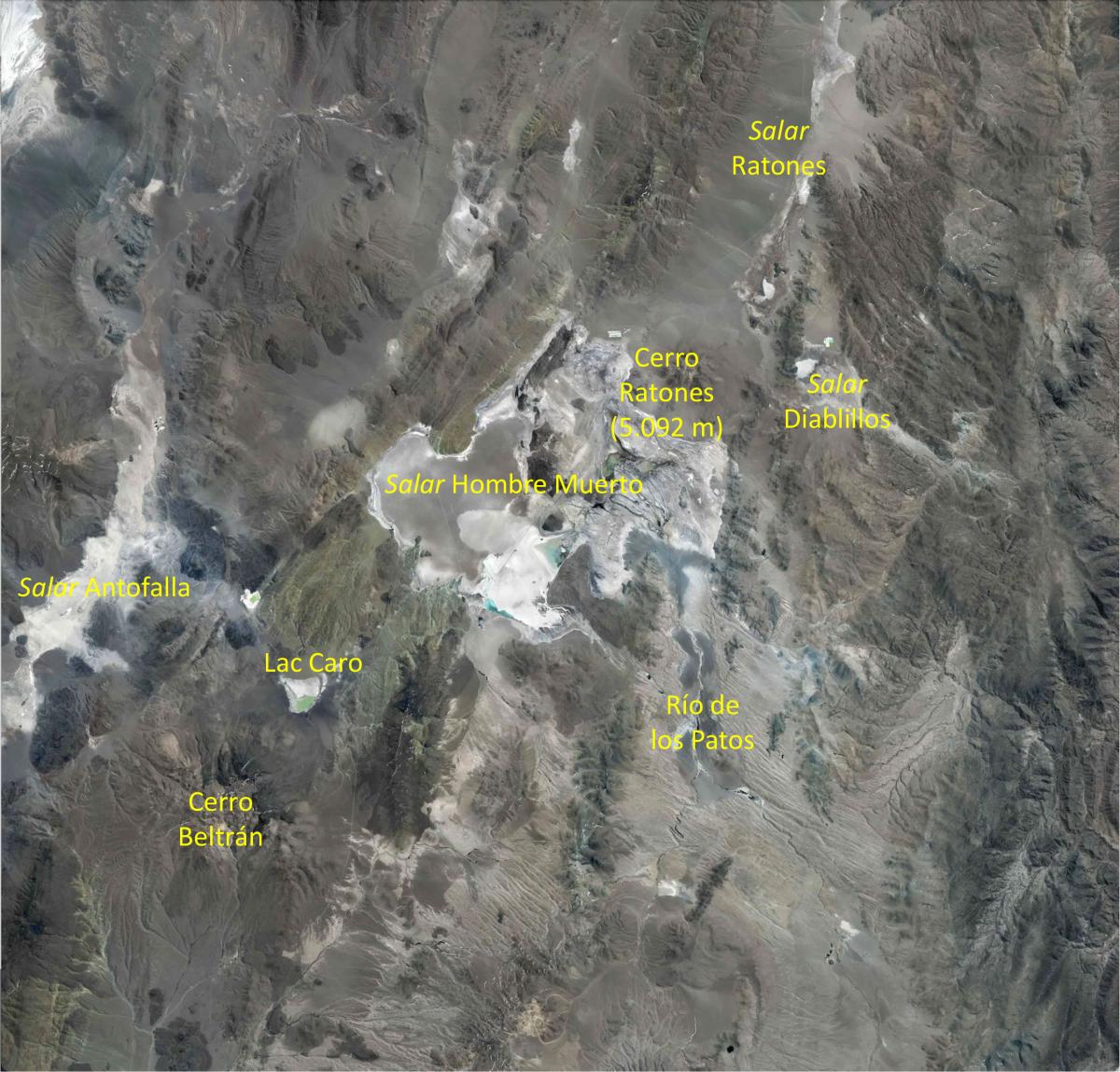 En Argentine, l’exploitation du lithium est effective à partir de 1998, lorsque l’entreprise étasunienne FMC (Food Machinery and Chemical Corporation) lance son activité industrielle sur le salar Hombre Muerto. Ce dernier est la principale structure géologique visible au centre de l’image. Sa couleur blanche est due aux concentrations de sels qui caractérisent les salares.