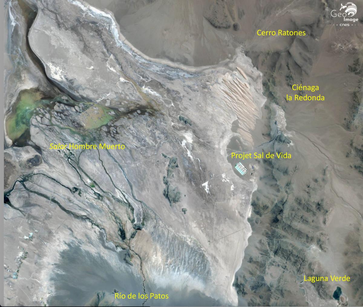 Cette image montre une portion de la rive Est du salar Hombre Muerto, située dans la province de Catamarca, à proximité du village de Ciénaga la Redonda. Un ensemble de piscines d’évaporation y a vu le jour à partir de 2019, dans le cadre du projet Sal de Vida. Ce projet est né en 2009, porté par un consortium d’actionnaires canadiens et coréens qui a entamé les relevés géologiques, réalisé des forages d’exploration et rédigé une première étude de faisabilité. Puis, à partir de 2012, l’entreprise minière australienne Galaxy Resources Limited a pris le contrôle du projet, poursuivant les forages et les études de faisabilité.