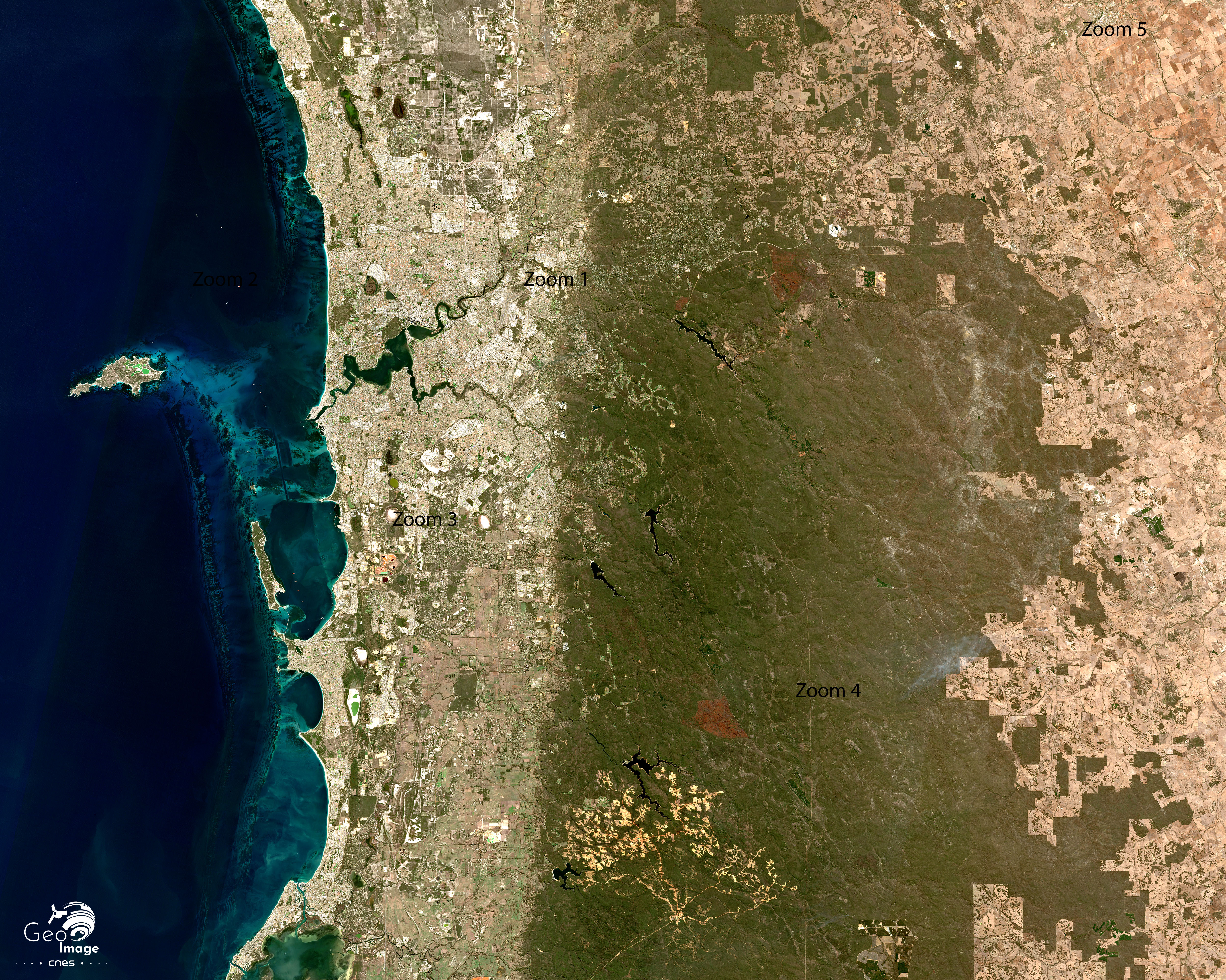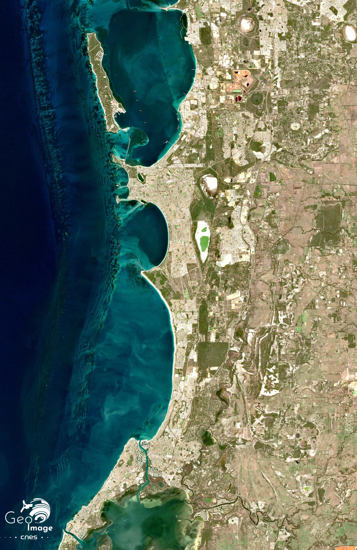 La région est soumise au climat méditerranéen et est irriguée par de nombreux cours d’eau comme la Canning River et la Swan River autour desquels l’agglomération de Perth s’est bâtie. Il en va de même pour l’estuaire de la Swan River (au centre de l’image), interface autour duquel se sont développées des activités portuaires (à Fremantle), industrielles et récréatives (zoom 1). L’image satellite fait bien apparaître l’organisation spatiale de la région en trois bandes parallèles, orientées nord-sud.