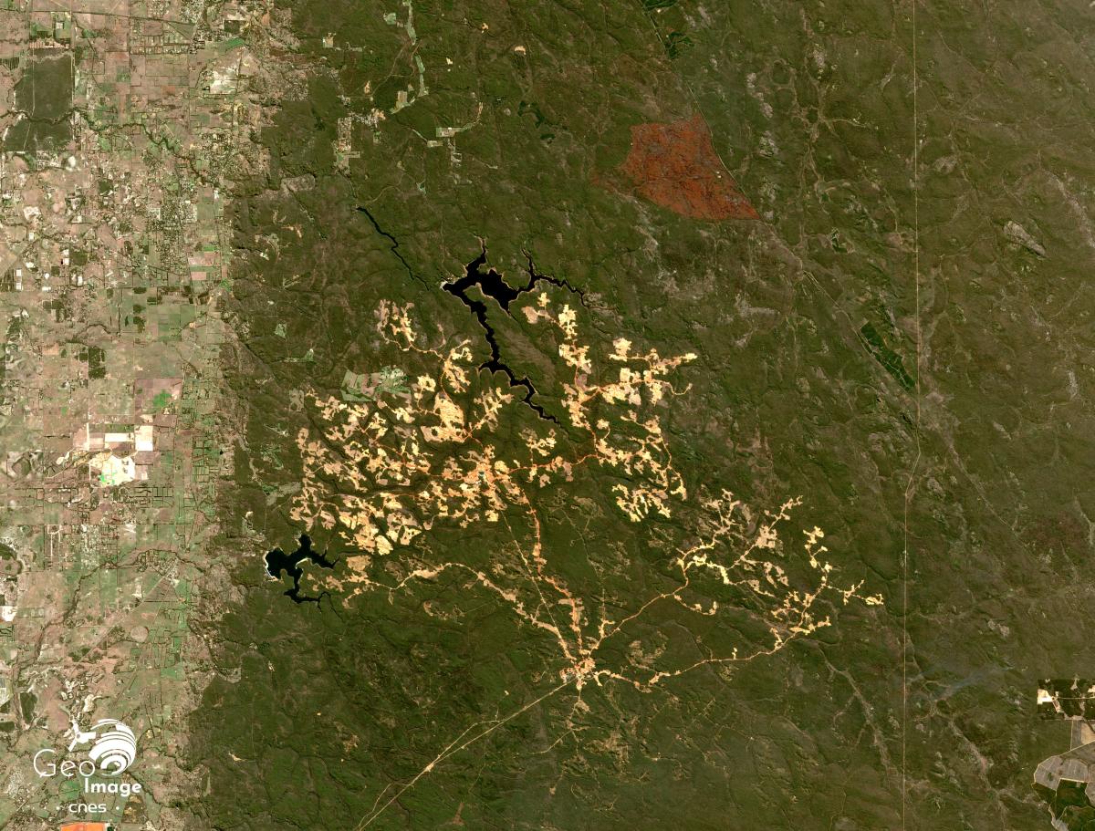 Par ailleurs, il s’agit de forêts très surveillées dans la mesure où les feux y sont fréquents. Les différentes couleurs du couvert forestier de l’image permettent de constater l’évolution différenciée de certaines parcelles forestières. La population est particulièrement vigilante aux feux de bush à proximité des communes périurbaines de l’est de l’agglomération de Perth (visible à l’ouest du zoom), de la même façon les routes, comme la Great Eastern Highway qui longent des forêts en traversant les Darling Range, sont autant de lieux d’observation pour les Australiens qui permettent de signaler d’éventuels départs de feu.