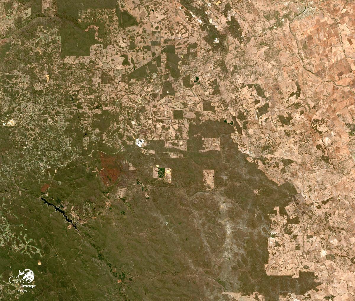 L’image satellite donne à voir la région de Perth en Australie-Occidentale. Il s’agit de la capitale de cet immense Etat fédéré, grand comme cinq fois la France. C’est à Perth que se concentre 80 % des 2,6 millions d’habitants de l’Australie-Occidentale, qui est donc très largement désertique (densité : 0,93 hab./km2). Comme a pu l’écrire le géographe Joël Bonnemaison la région de Perth apparaît comme un « réduit fertile » d’exception à la différence de la majeure partie de l’Etat marquée par l’aridité (Bonnemaison, 1995).