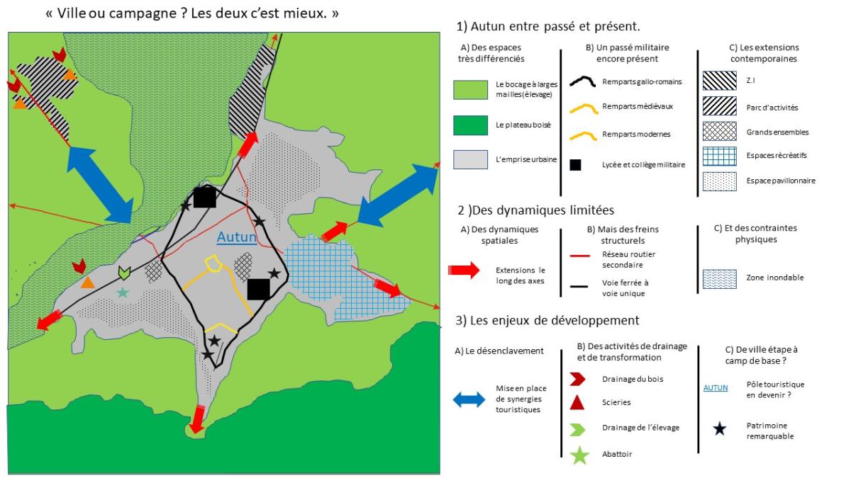 Autun comme beaucoup d’autres petits pôles urbains français ne sont pas forcément des territoires sans avenir. Ils ont suivi à peu près tous les mêmes évolutions territoriales et démographiques. De leurs capacités à mettre en œuvre des projets cohérents dépend leur avenir. Ainsi Autun, malgré de nombreuses difficultés mais aussi de réels atouts, essaie de trouver de nouveaux motifs d’espoir, à travers un ancrage territorial fort (filière bois et élevage) et d’une ouverture vers l’extérieur (tourisme). Ainsi les remparts du passé pourront tomber, voire être valorisés…