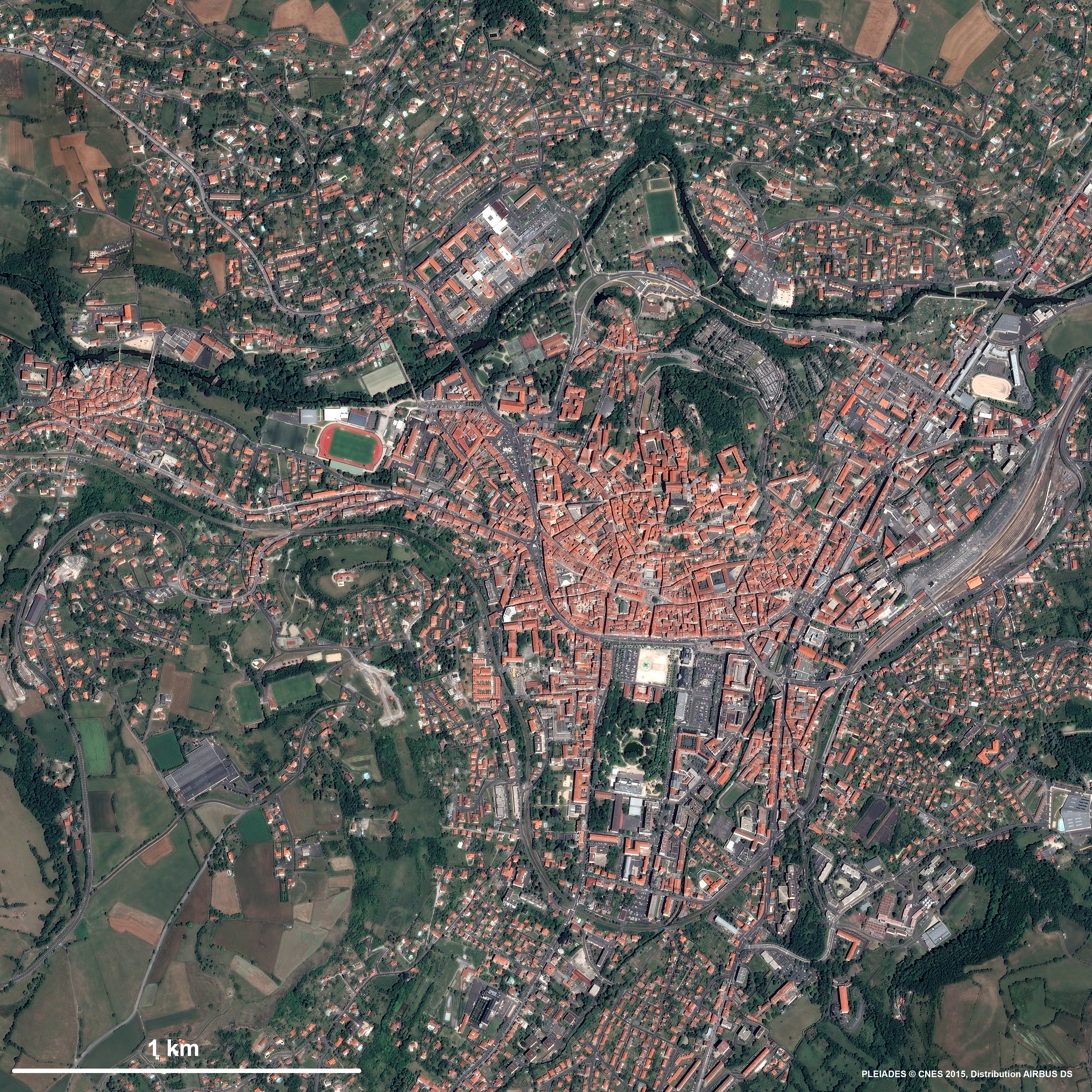 L’unité urbaine - formée par l’extension du bâti - compte ainsi neuf communes et regroupe près de 17 % de la population départementale. Sur l’image sont principalement visibles celle d’Aiguilhe, au nord (rive gauche de la Borne), qui comprend aussi la pointe sur la rive sud ; celle d’Espaly-Saint-Marcel, sur un assez large bord ouest de l’image, à partir des terrains de sport ; et le début de celle de Vals-près-le-Puy, au sud-est de l’image, au-delà de la voie ferrée.