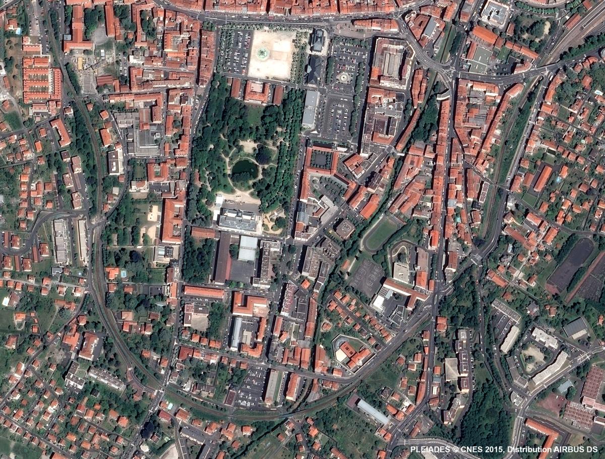L’image permet d’identifier clairement les différentes auréoles formées par la croissance urbaine. Au cœur de l’agglomération, la ville ancienne s’organise sur le flanc sud d’une colline qui occupe le centre de ce noyau originel. Elle est bordée au nord par le tracé d’une rivière, la Borne, qui serpente pour rejoindre la Loire à 1,5 km à l’est hors de l’image.