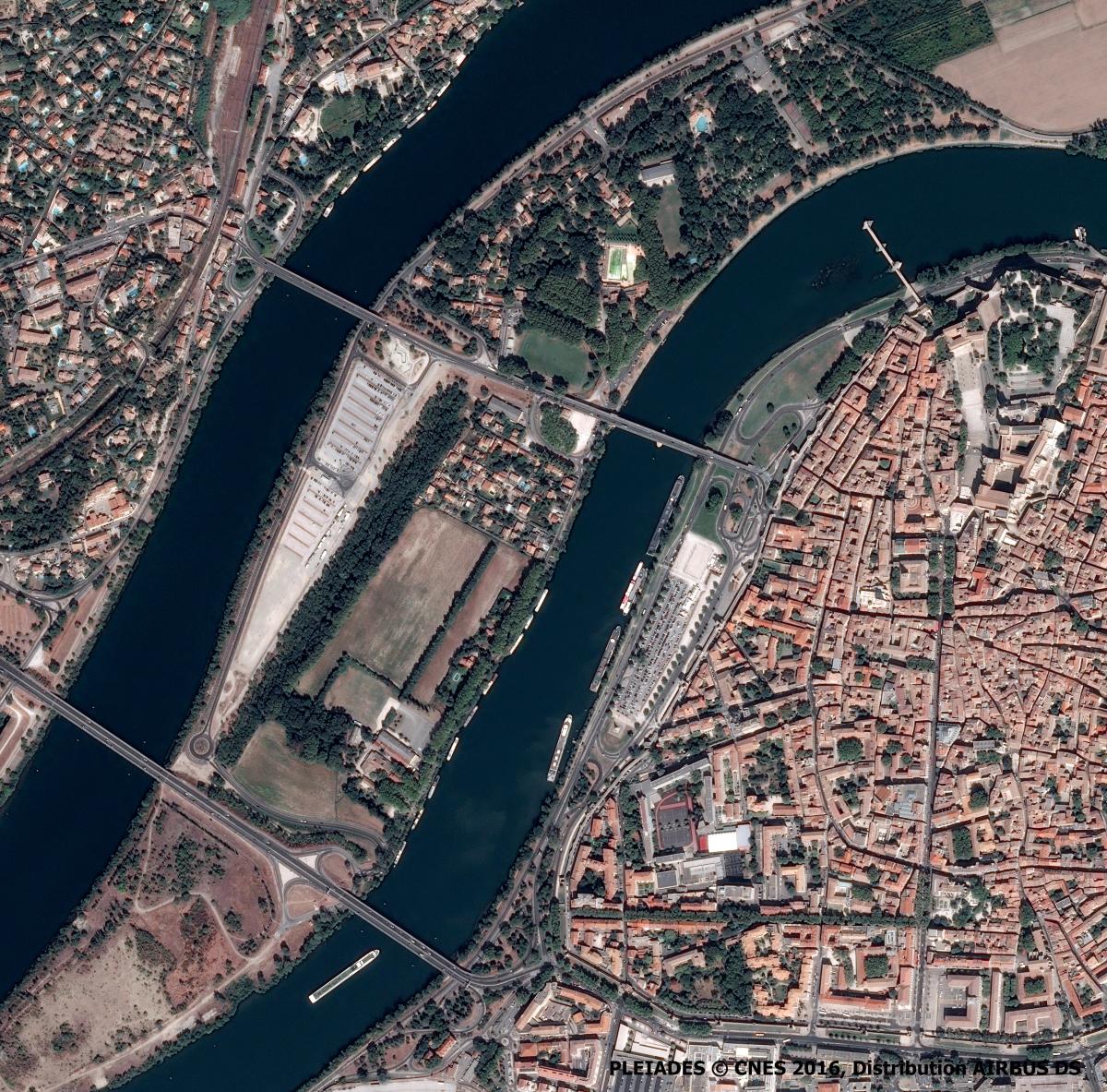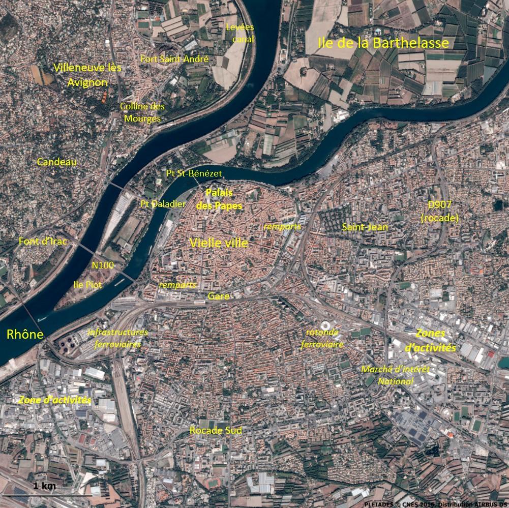 Cette image, centrée sur la partie intramuros d’Avignon, qu’entourent les 4,3 kilomètres de remparts marqués de 16 portes, présente l’extension de l’urbanisation vers l’Est et le Sud mais également en rive droite du Rhône, sur le territoire de Villeneuve-lès-Avignon, située dans le Gard. Le bras Ouest du Rhône, ou grand Rhône, marque en effet la limite entre le Vaucluse, dont Avignon est la préfecture, et le Gard. L’ile de la Barthelasse séparée de la ville par le petit Rhône, fait partie de la commune et en constitue l’un des 9 quartiers.