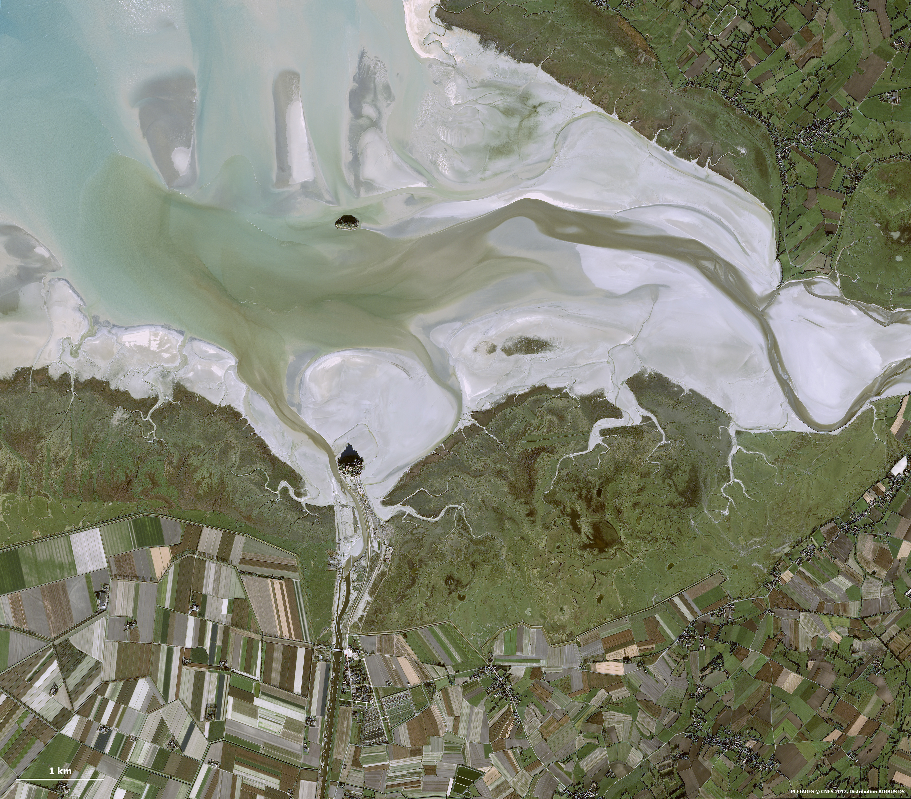 La Baie et le Mont-Saint-Michel : un espace et un système exceptionnels : cette image a été prise par un satellite Pléiades le 20/04/2017. Il s’agit d’une image en couleurs naturelles, de résolution native à 0,70m, ré-échantillonnée à 0,5m.