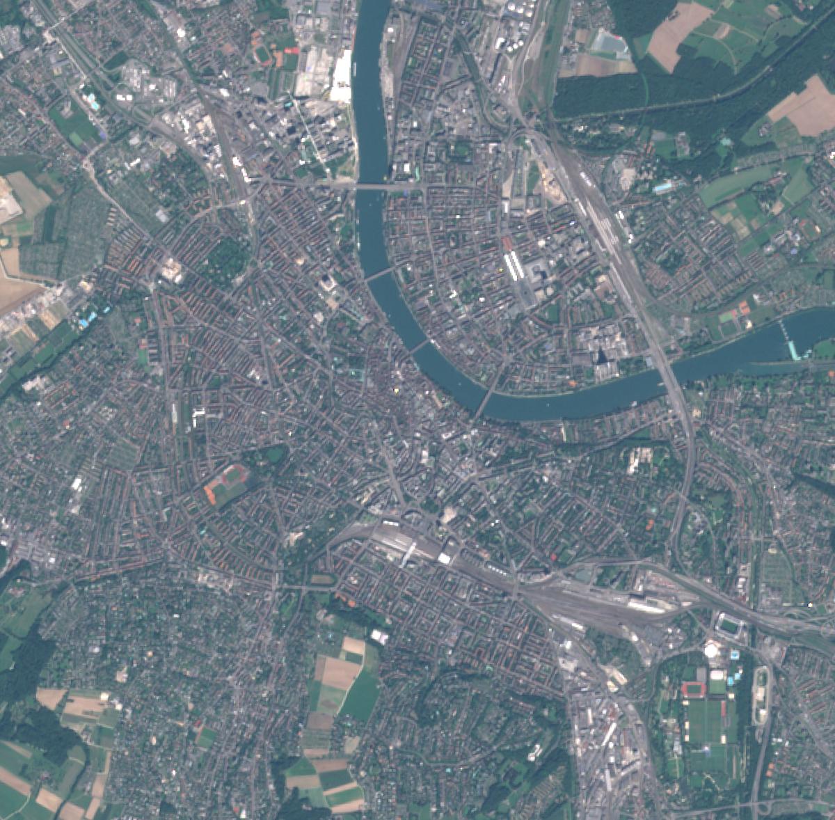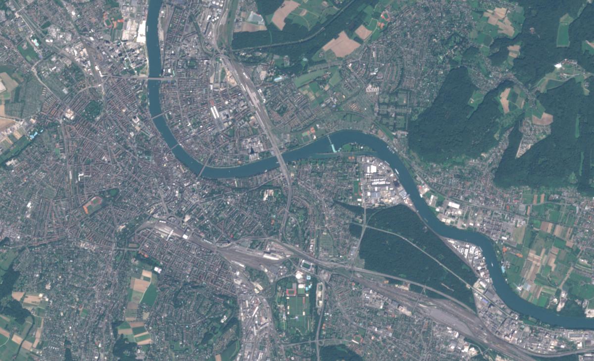 Esta imagen de Basilea, ciudad situada en el noroeste de Suiza, fue sacada el 23 de agosto de 2016 por un satélite Sentinel-2. Se trata de una imagen en colores naturales de resolución a 10 metros.