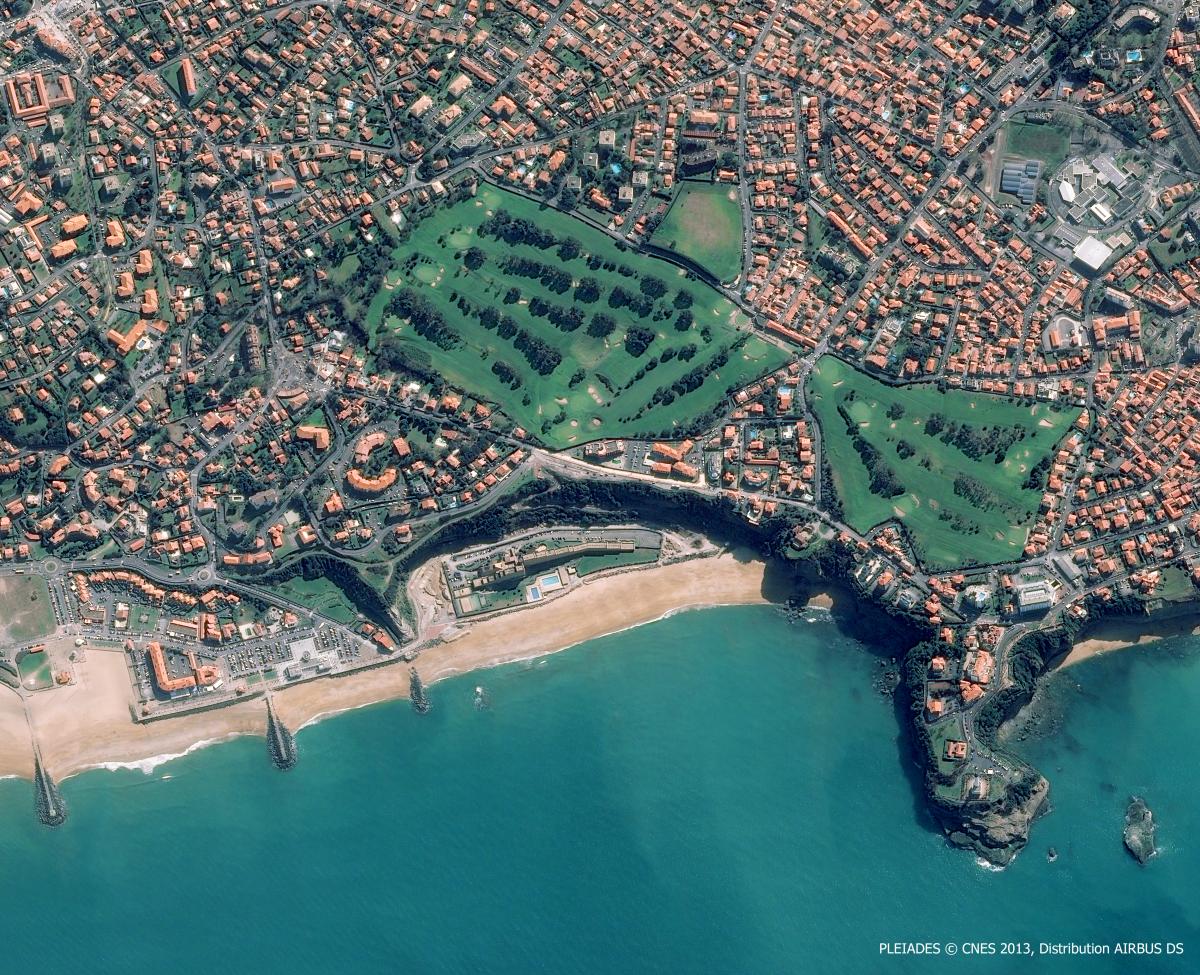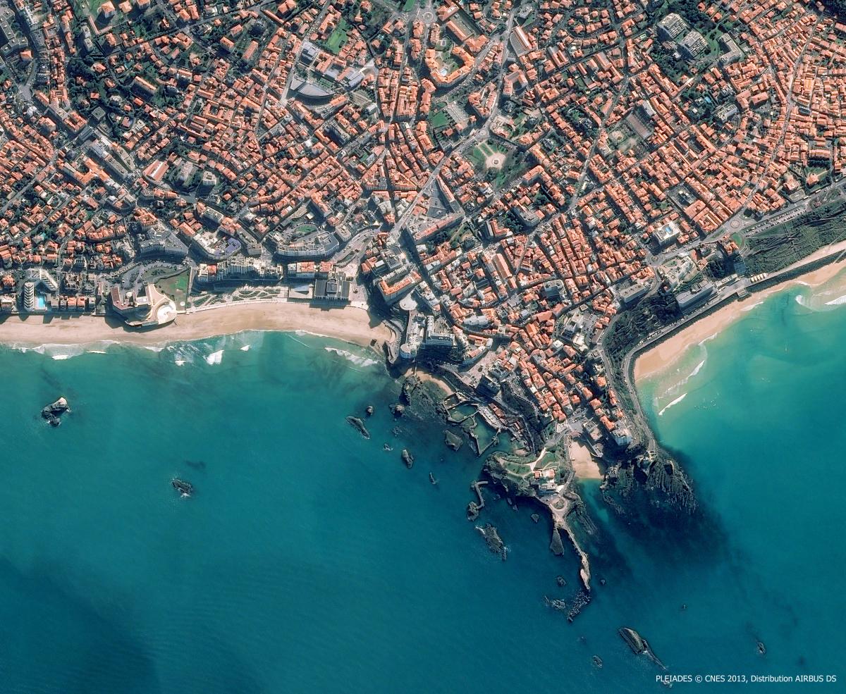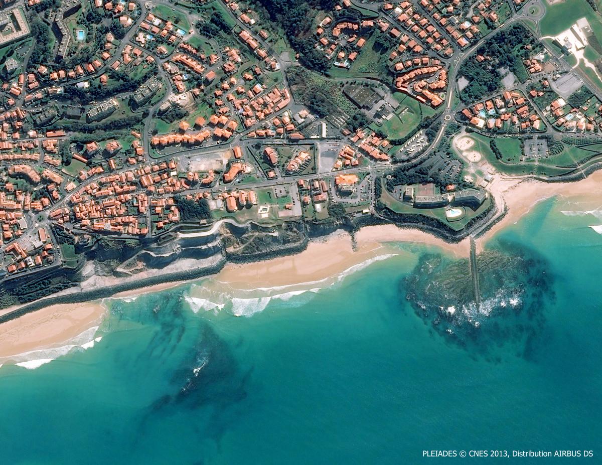 Biarritz, pression anthropique et mutations du littoral atlantique. Cette image a été prise par un satellite Pléiades le 03/03/2013. Il s’agit d’une image en couleurs naturelles, de résolution native à 0,70m, ré-échantillonnée à 0,5m.