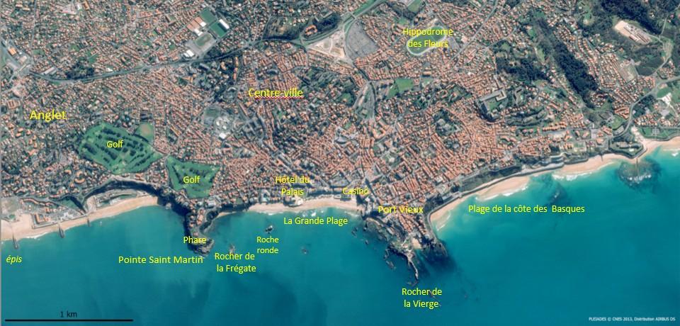 L’image présentée ici s’inscrit dans la partie terminale sud de la conurbation dite « BAB », Biarritz-Anglet-Bayonne. C’est en effet un espace fortement occupé, aménagé et valorisé par l’homme comme en témoigne la densité du bâti, que ce soit pour des constructions anciennes mais aussi récentes, bien que ces dernières se réduisent tant l’espace biarrot est saturé et artificialisé. Au total, l’Agglomération Côte Basque-Adour s’étend sur 80 km2 et présente une densité urbaine de 1.520 habitants/km2.