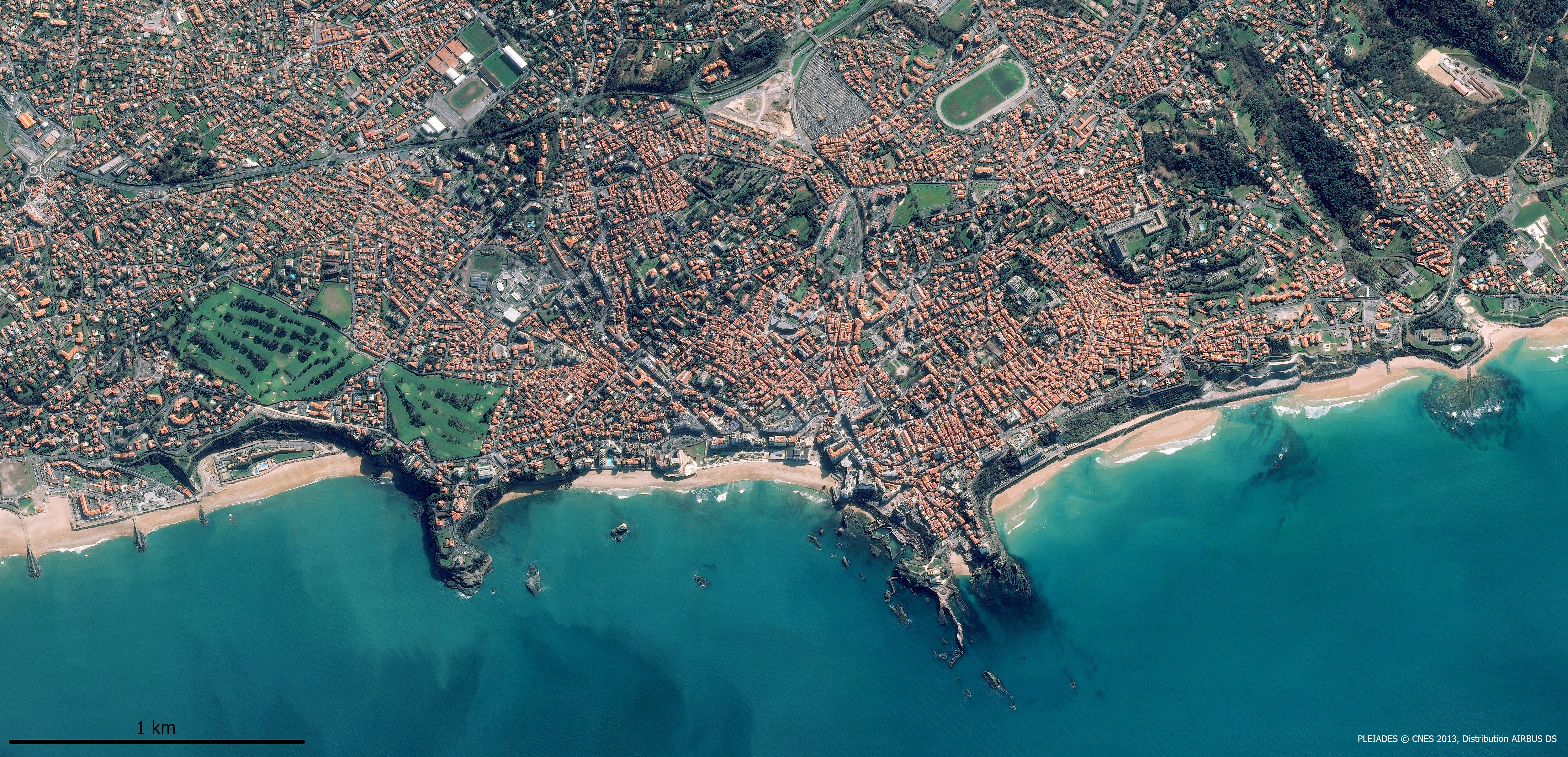 Biarritz, pression anthropique et mutations du littoral atlantique. Cette image a été prise par un satellite Pléiades le 03/03/2013. Il s’agit d’une image en couleurs naturelles, de résolution native à 0,70m, ré-échantillonnée à 0,5m.