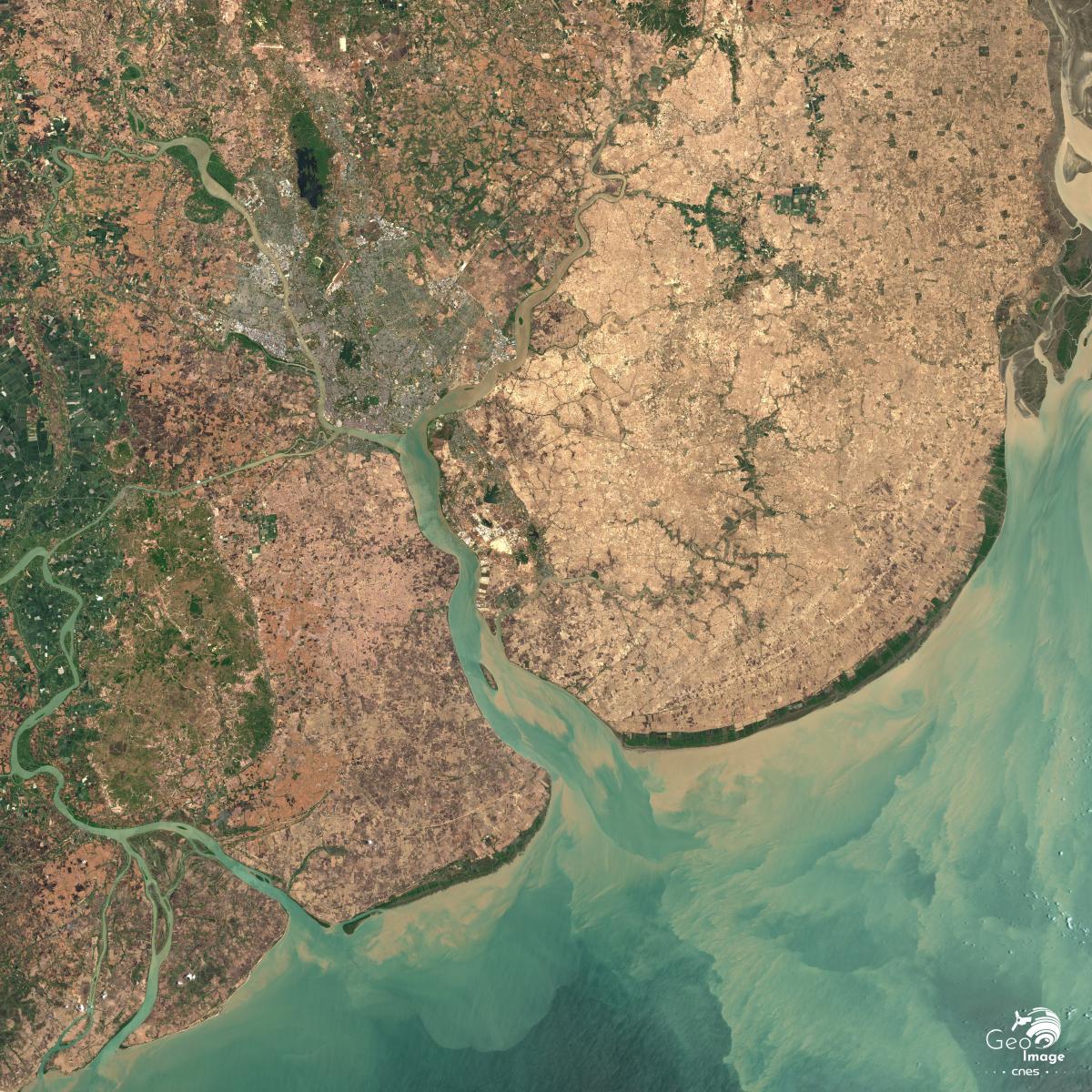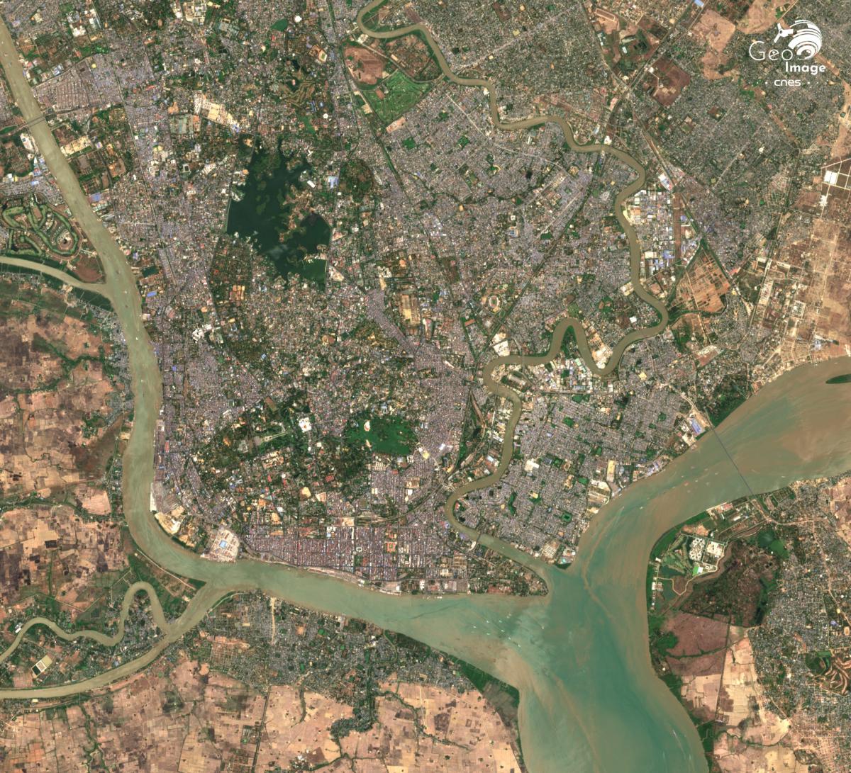 Image de la plus grande ville du Myanmar (ex-Birmanie), Yangon (anciennement nommé Rangoun). Cette image a été prise par le satellite Sentinel-2B le 28 avril 2019. Il s’agit d’une image en couleurs naturelles de résolution native à 10m.