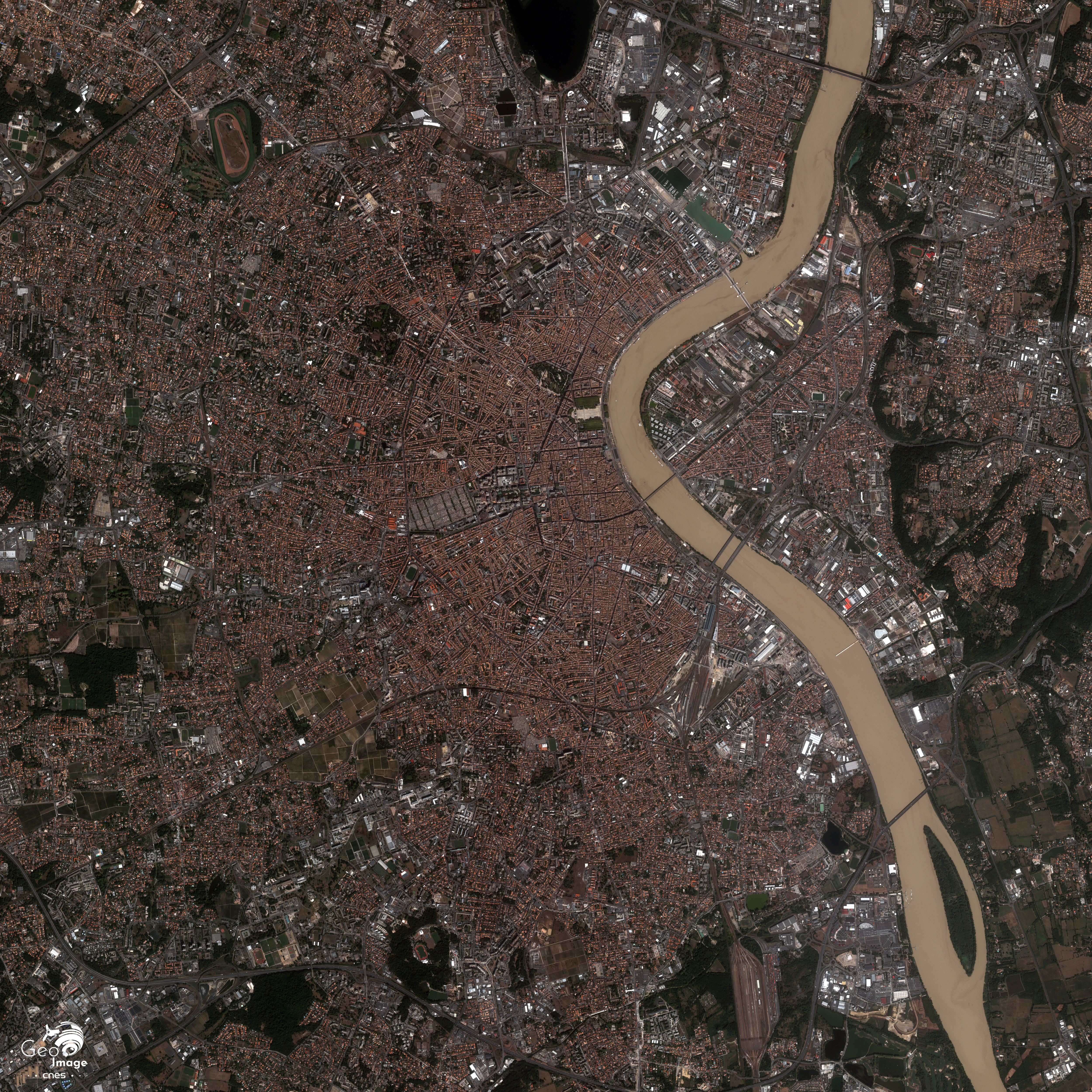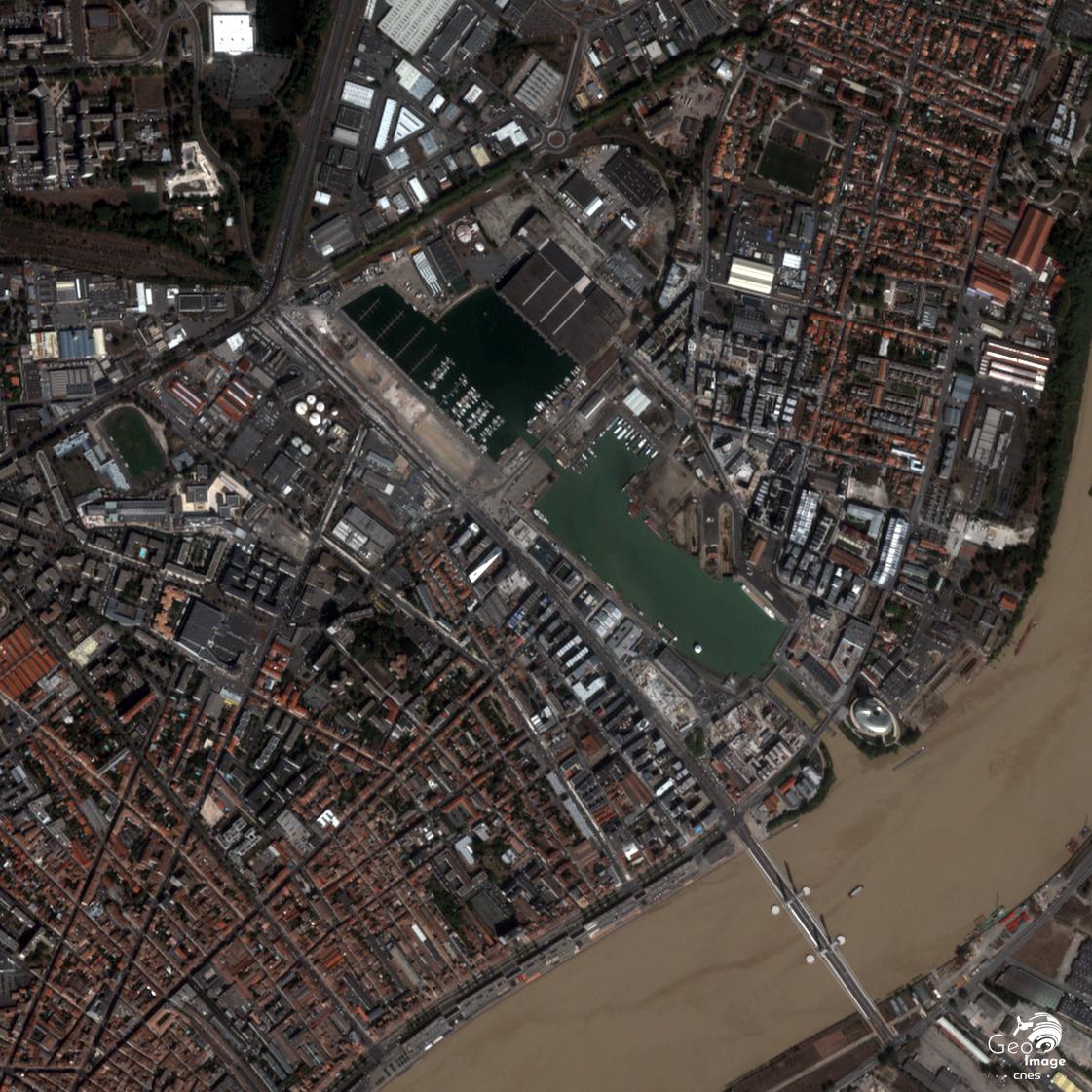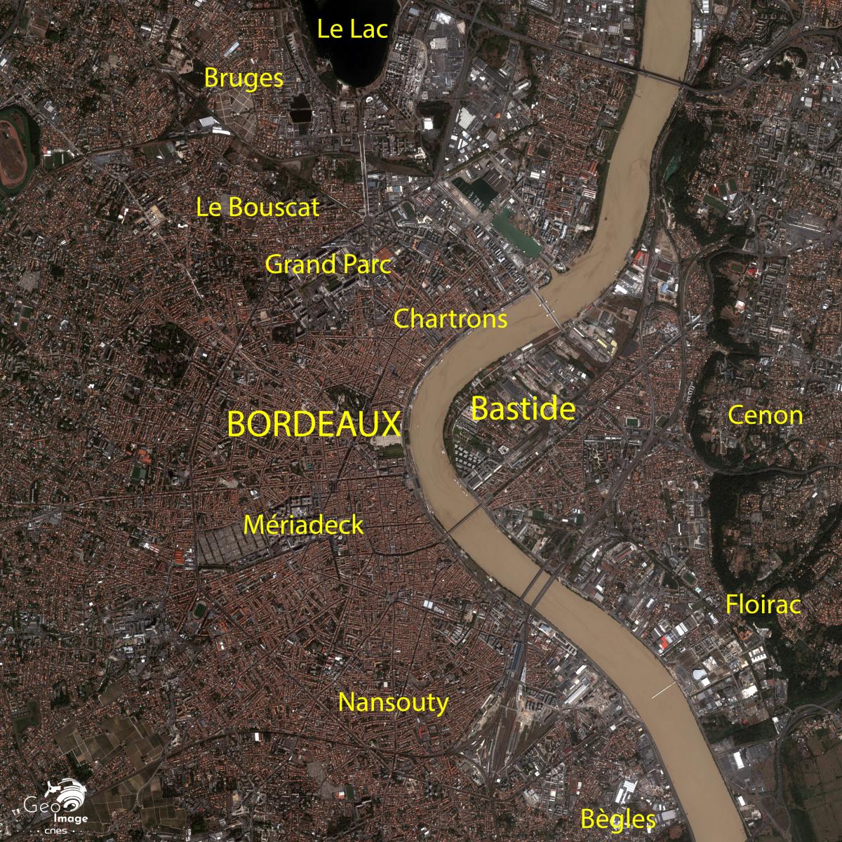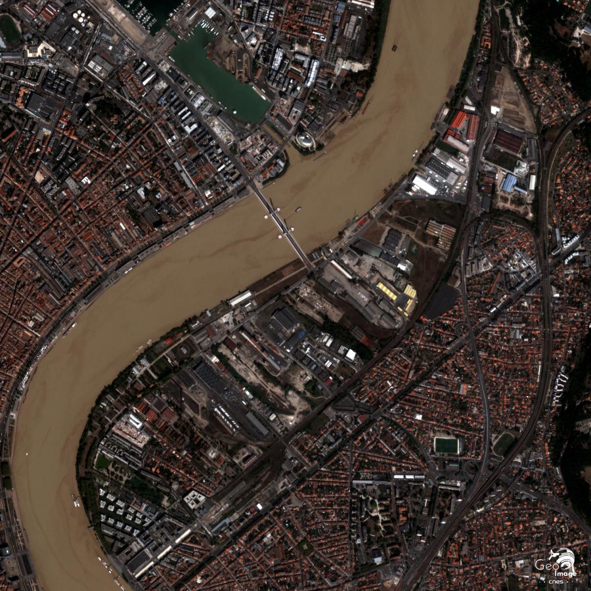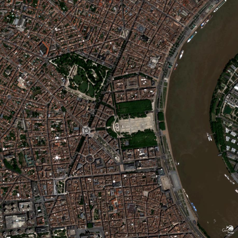 Le lit mineur du fleuve, visiblement régularisé, est large et va s’évasant vers l’aval : 500 mètres au niveau du Pont de Pierre, au cœur de la ville, 750 mètres une dizaine de kilomètres en aval en haut de l’image. Sur la rive gauche, le centre-ville historique occupe la rive concave d’un méandre, afin de minimiser le risque d’inondation : ce site lui confère la forme en croissant à l’origine de l’expression « Port de la Lune ».