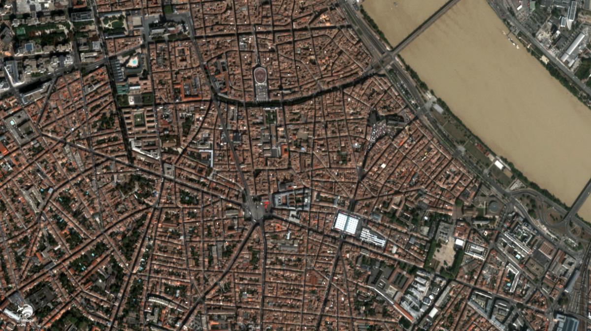Mais c’est surtout l’urbanisme de prestige hérité de l’apogée du commerce triangulaire au XVIIIe siècle qui fait la célébrité de Bordeaux. On repère sur l’image la somptueuse Place de la Bourse érigée en front de fleuve avec son plan symétrique typique de l’architecture classique, qui témoigne de l’importance du port de commerce dans la prospérité de la ville. Au nord-ouest de cette place, le « Triangle d’Or » formé par les Allées de Tourny, du nom de l’Intendant qui fut le grand aménageur de Bordeaux au XVIIIe siècle, le cours Georges Clémenceau et le cours de l’Intendance, avec le Grand Théâtre à l’un de ses sommets, témoigne également de cette opulence.