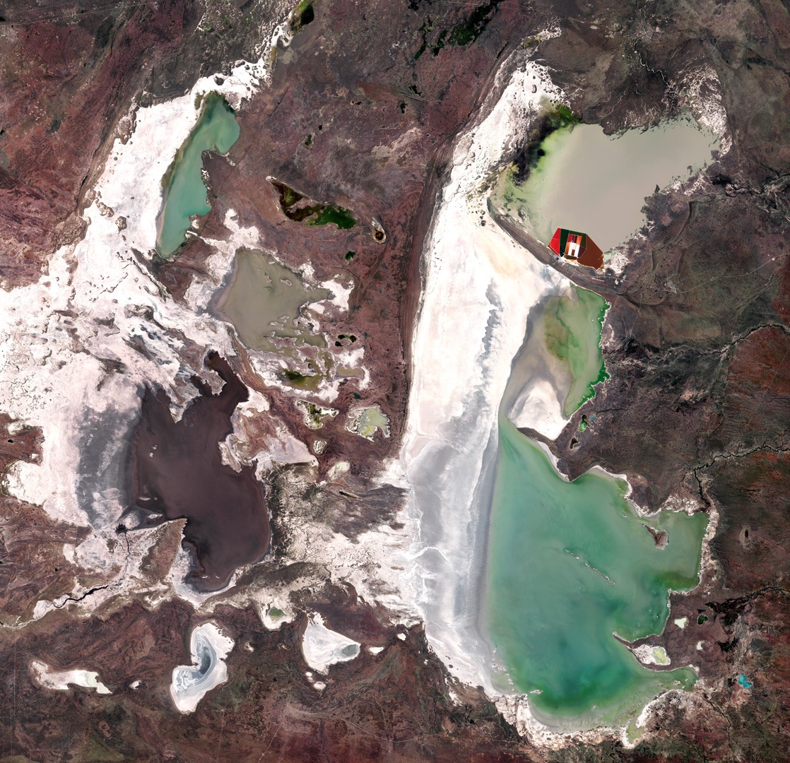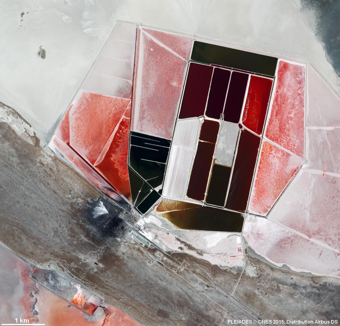 Au centre de l’image, un phénomène retient l’attention : la présence de vastes formes géométriques de couleurs rouges, orange ou brunes. On distingue bien au nord une série de bassins successifs aux formes géométriques et bordés de puissantes digues. Ce sont des tables d’évaporation; elles couvent une surface de 22 km2.
