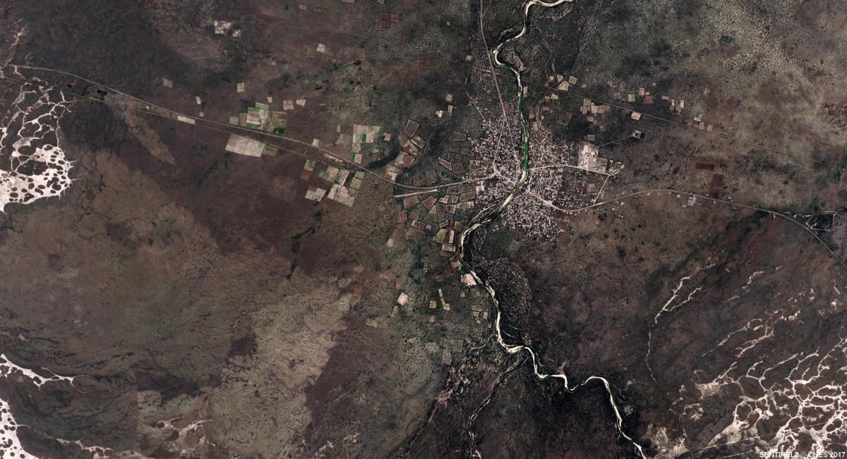 Sur le document, son lit mineur apparaît assez sinueux et encombré de matériaux détritiques arrachés par l’érosion, il est largement à sec malgré la présence de quelques poches d’eau apparaissant en vert lors de la prise de vue. Le cours majeur pour sa part est assez large et marqué par les bras morts et les méandres recoupés liés aux divagations de la rivière. Cette morphologie est étroitement associée au régime fluvial de la Nata River. Elle apporte en effet par intermittence lors de la saison des pluies ses eaux sous forme de crues plus ou moins puissantes et demeure à sec le reste de l’année sur le modèle des systèmes d’oueds.