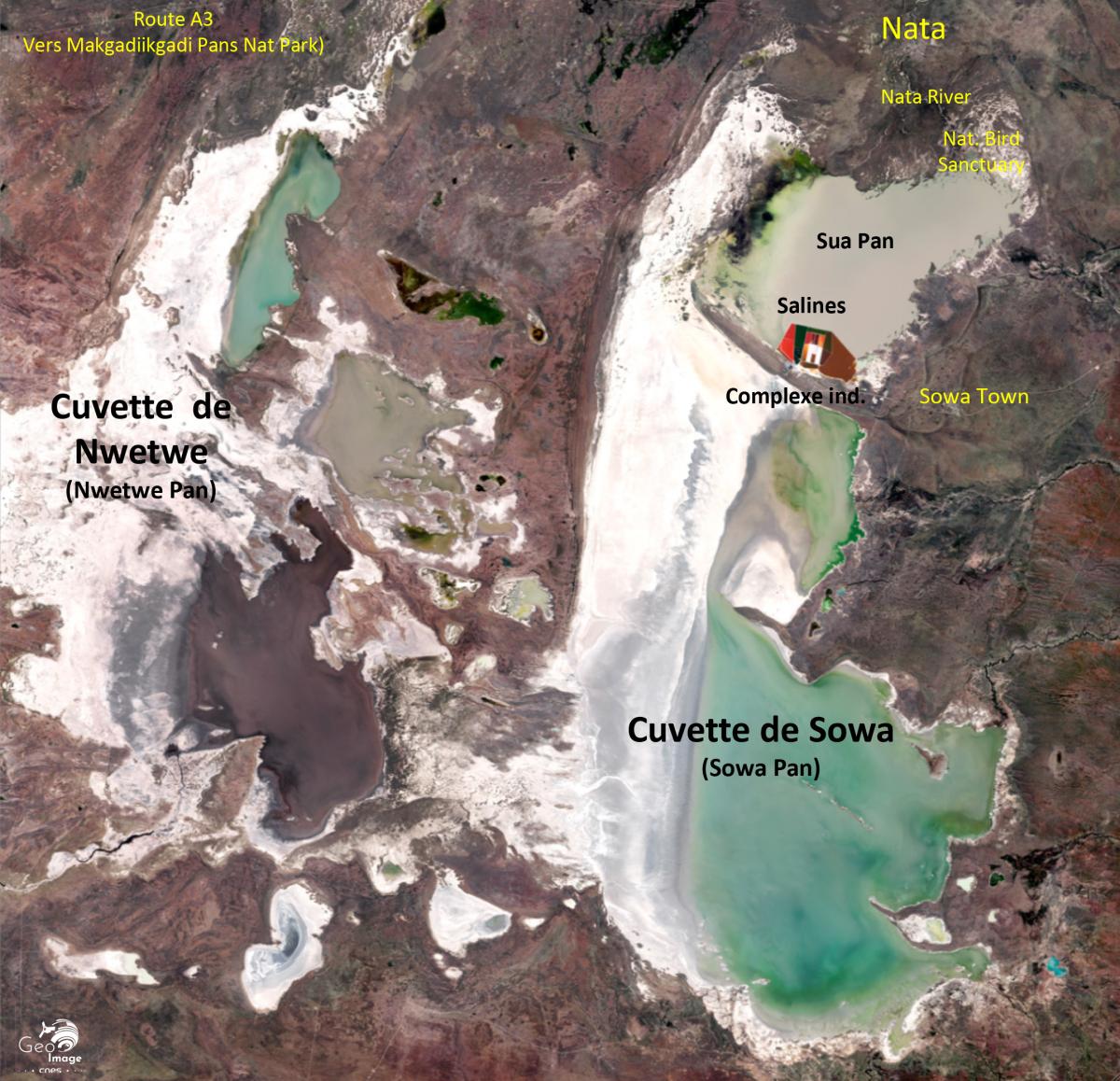 Le document est une photo de la cuvette Sowa (ou Sua Pan), qui se déploie au nord-est du pays sur 100 km nord/sud et sur 50 km est/ouest et couvre 16 058 km2. Du fait de la topographie, elle a une structure endoréique : c’est un bassin fermé sans lien avec les mers et les océans dans lequel vient se jeter le réseau hydrographique local ou régional.