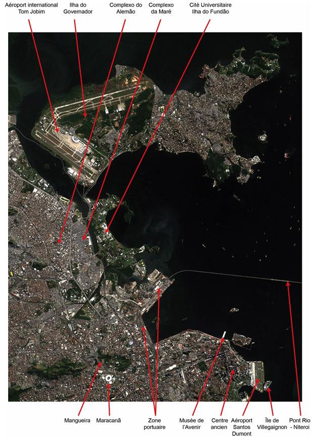 Ce zoom associe le centre historique, la zone portuaire, les deux aéroports (vols intérieurs et vols internationaux) et une petite partie de la Zona Norte, la Zone Nord, la plus vaste et la plus pauvre de la ville. Elle associe quartiers populaires et favelas, dont deux, visibles sur l’image, ont été le théâtre de violents affrontements en 2008 et 2009, lorsque les pouvoirs publics ont entrepris de les « reconquérir » en délogeant les narcotrafiquants qui y faisaient la loi.