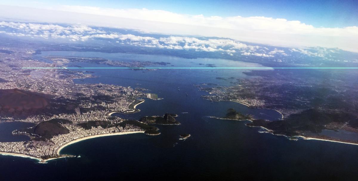 Une vue aérienne complète bien le zoom sur l’image satellitaire et le relie au zoom précédent : au premier plan Niteroi, au-delà de la baie le centre historique, à droite le pont Rio-Niteroi et la Zona Norte, à gauche le Pain de Sucre, le goulet d’entré de la baie et la Zona Sul, en arrière-plan les massifs montagneux de la Tijuca et de la Pedra Branca.