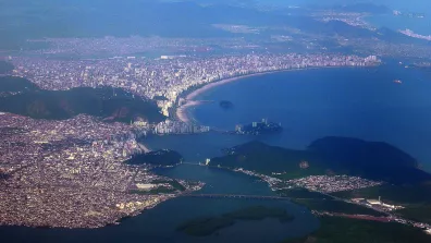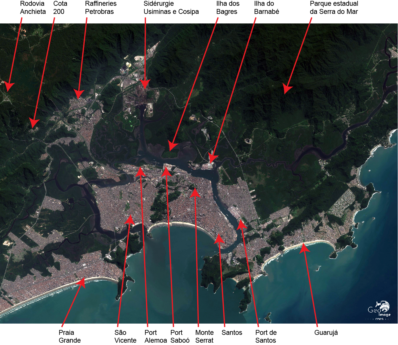 La cohabitation est également problématique avec une autre des activités majeures de la région, le tourisme balnéaire de masse, dans des stations très fréquentées par la population de São Paulo (Fig. 30). Toute une série d'entre elles se succèdent au long du littoral, vers le sud-est comme Praia Grande, ou vers le nord-ouest, comme Guarujá, la première d'une longue succession de stations qui s'étend désormais bien au-delà de l'image jusqu'à la frontière de l'État de Rio.
