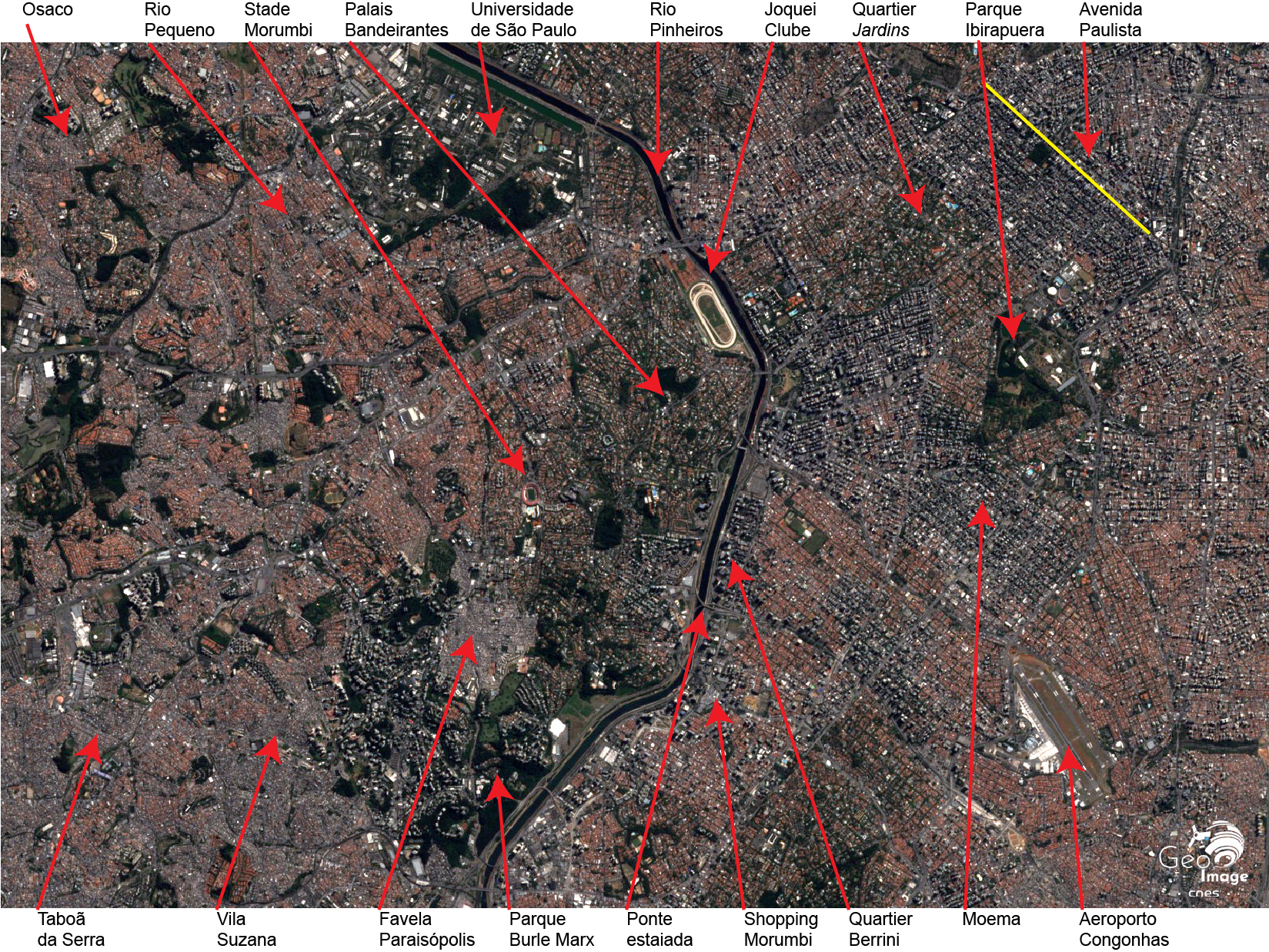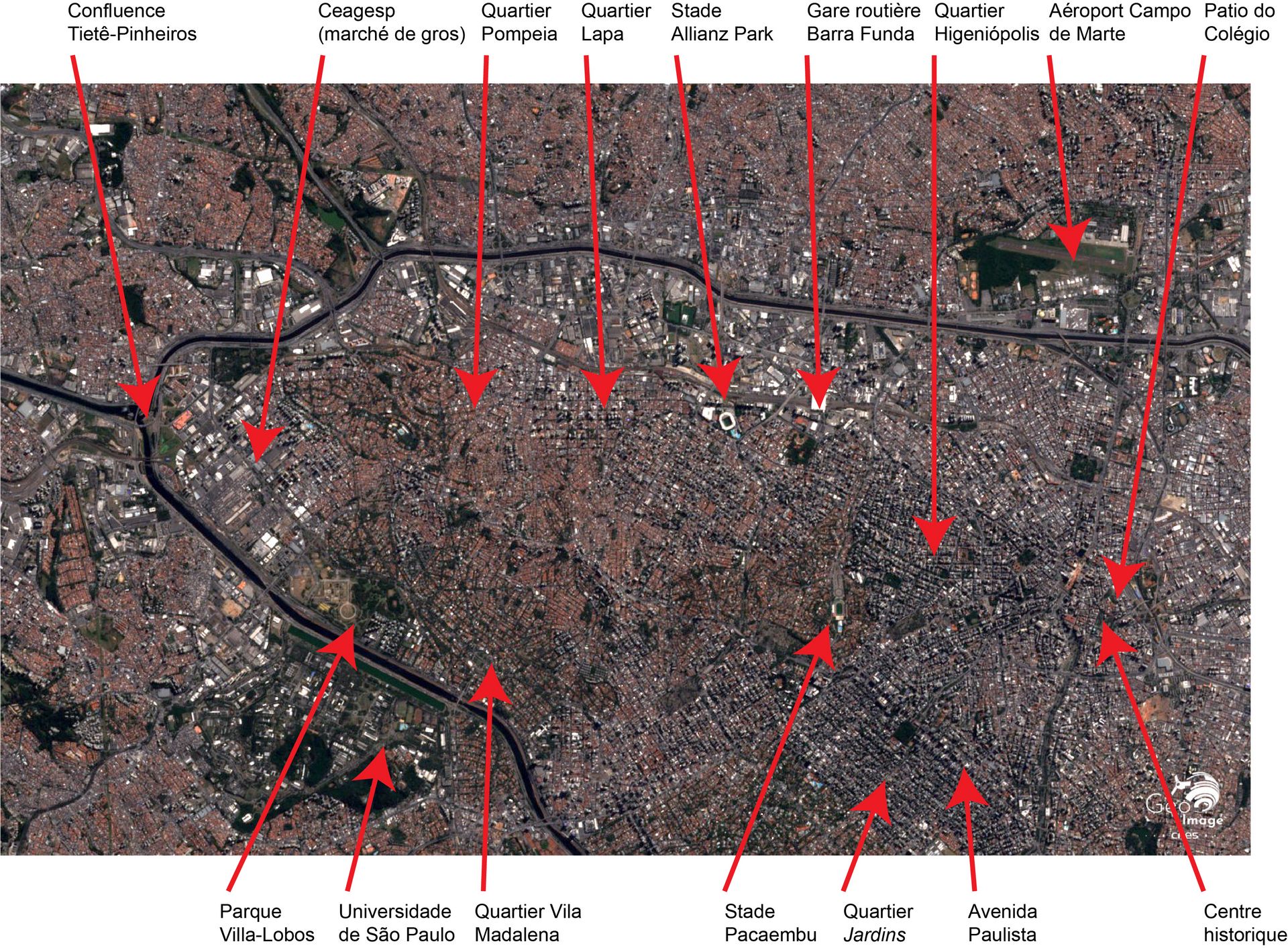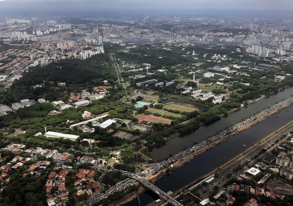 La vue aérienne (Fig. 16) complète la vue satellitaire. On y distingue le rio Pinheiros, le campus de l'Université de São Paulo (USP), l'hippodrome du Joquei Clube, le vaste parc d'Ibirapuera, ainsi que les stades Pacaembu et Allianz park, déjà visibles sur le zoom précédent.