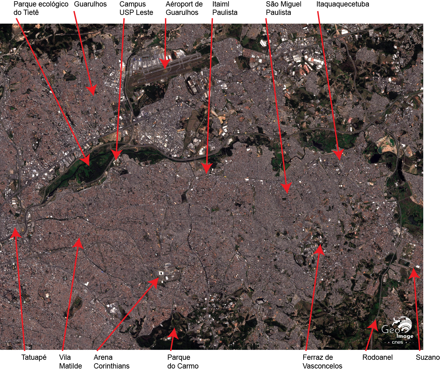 Ce qui saute aux yeux, sur le zoom comme sur la vue aérienne (Fig. 21), c’est l’absence d’axes structurants et d’espaces verts susceptibles de rompre le moutonnement de constructions basses s’étendant à perte de vue. Les seuls éléments facilement repérables sont la vallée du Tietê (notamment son parc écologique, cf. infra) et l’aéroport international de Guarulhos, situé dans la partie supérieure de l’image satellitaire.