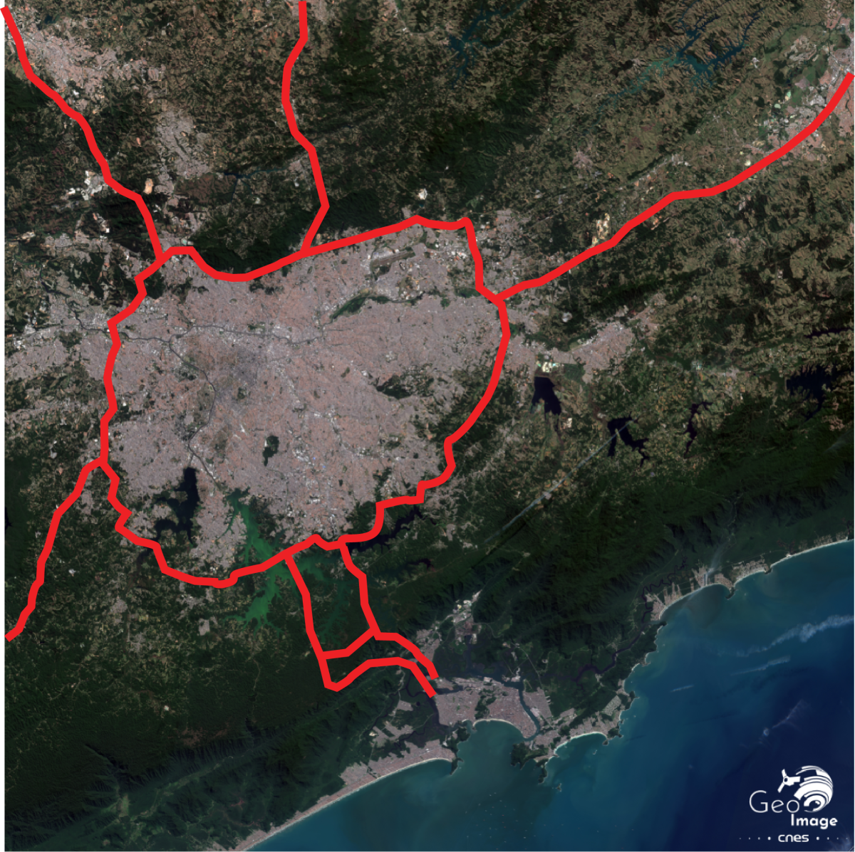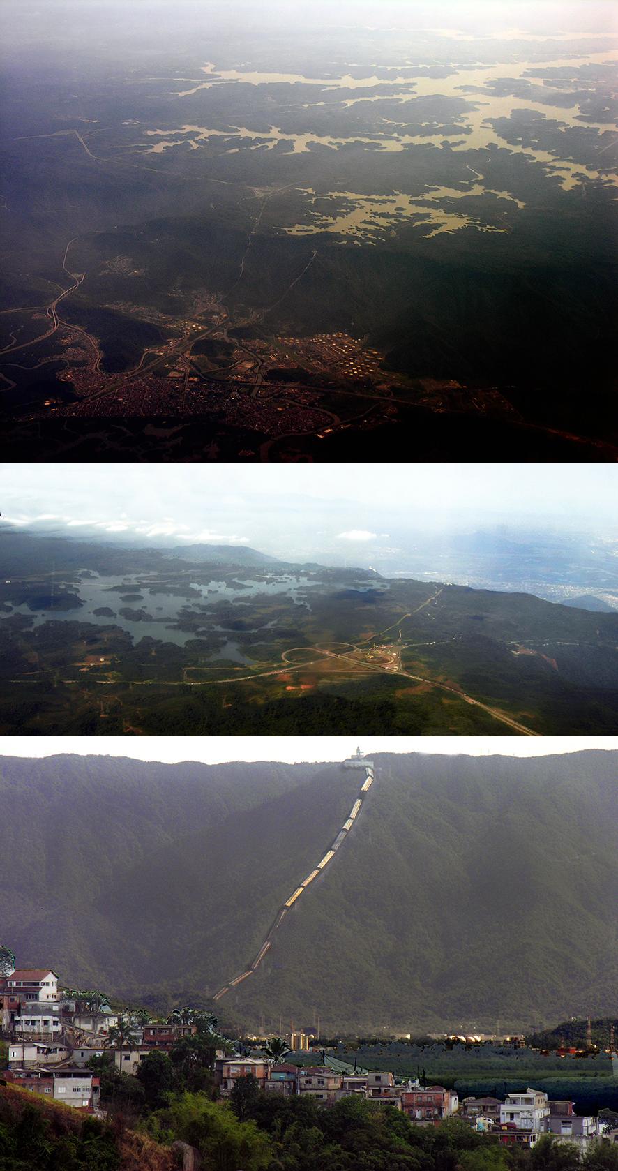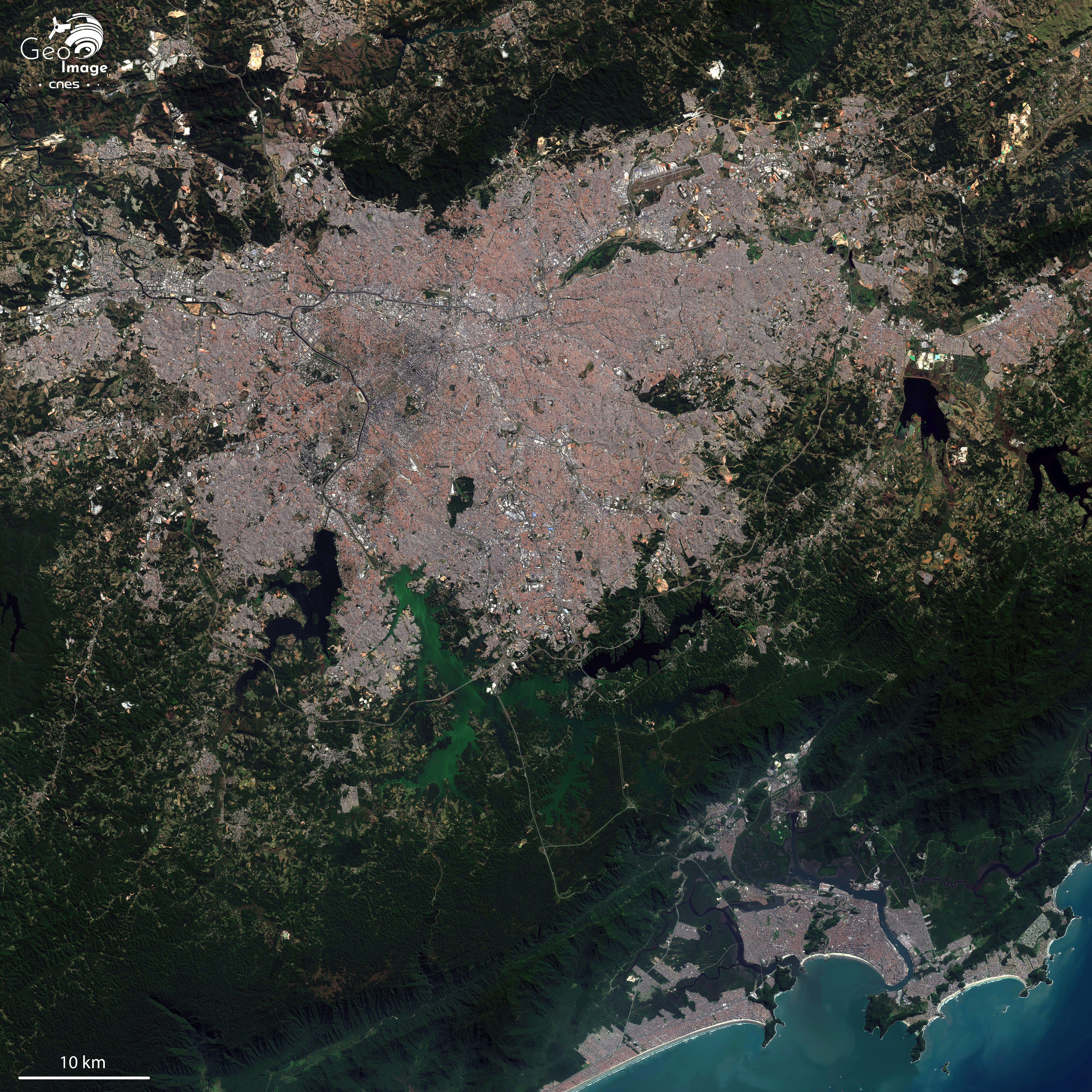 On y observe également les réservoirs créés à l'origine pour produire de l'hydroélectricité en profitant de la dénivellation de plus de 700m. Puis, plus tard, qui vont de plus en plus servir de réserve d'eau potable à la ville, avant qu'on y renonce à cause de leur pollution. D’ailleurs, sur l'image satellitaire, les deux principaux - Billings et Guarapiranga - ont des couleurs différentes, noir et vert, en fonction de la qualité de leurs eaux.